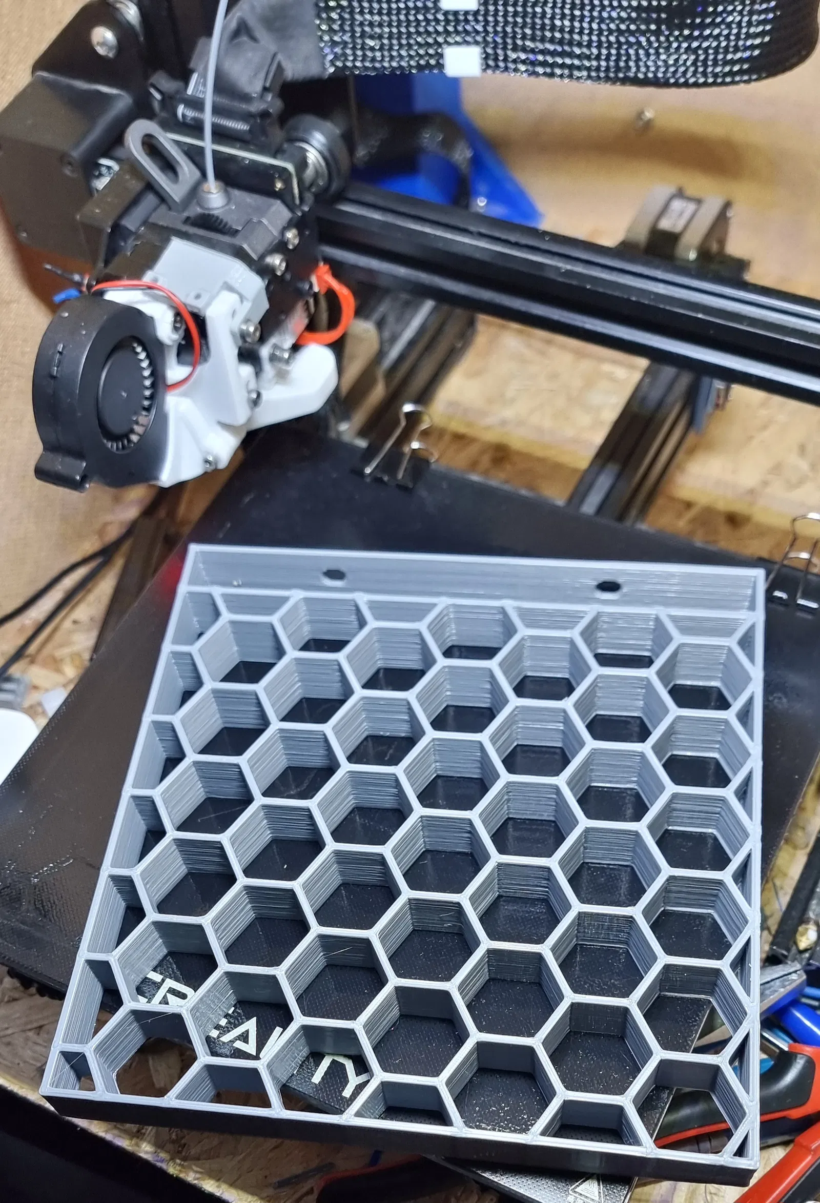 Tui muốn có thêm không gian làm việc nhỏ của mình, nên tui quyết định làm một cái kệ để bàn nhỏ. Có mấy mẫu khác rồi nhưng không có cái nào hợp ý tui với kích thước cái kệ tui muốn. Trông cũng khá chắc chắn á, tui cũng ham hố muốn thử đứng lên coi sao mà thôi tui không dám :) Tui tạo cái này bằng OpenSCAD để có thể tùy chỉnh được, thư viện Honeycomb từ: https://www.thingiverse.com/thing:2484395 Cảm hứng từ: /3d-model/gia-do-man-hinh-bang-to-ong-don-gian Tui in bằng nozzle 0.6mm, lớp in 0.48mm, nhìn không đẹp xuất sắc nhưng cũng không tệ lắm đâu, tui có thể xịt sơn đen mà tui cũng không quan tâm lắm. Tui chưa thêm STL nào hết vì nó còn tùy thuộc vào kích thước miếng gỗ nha. Nếu thích mẫu này thì xem thử mấy mẫu OpenSCAD khác của tui nha.