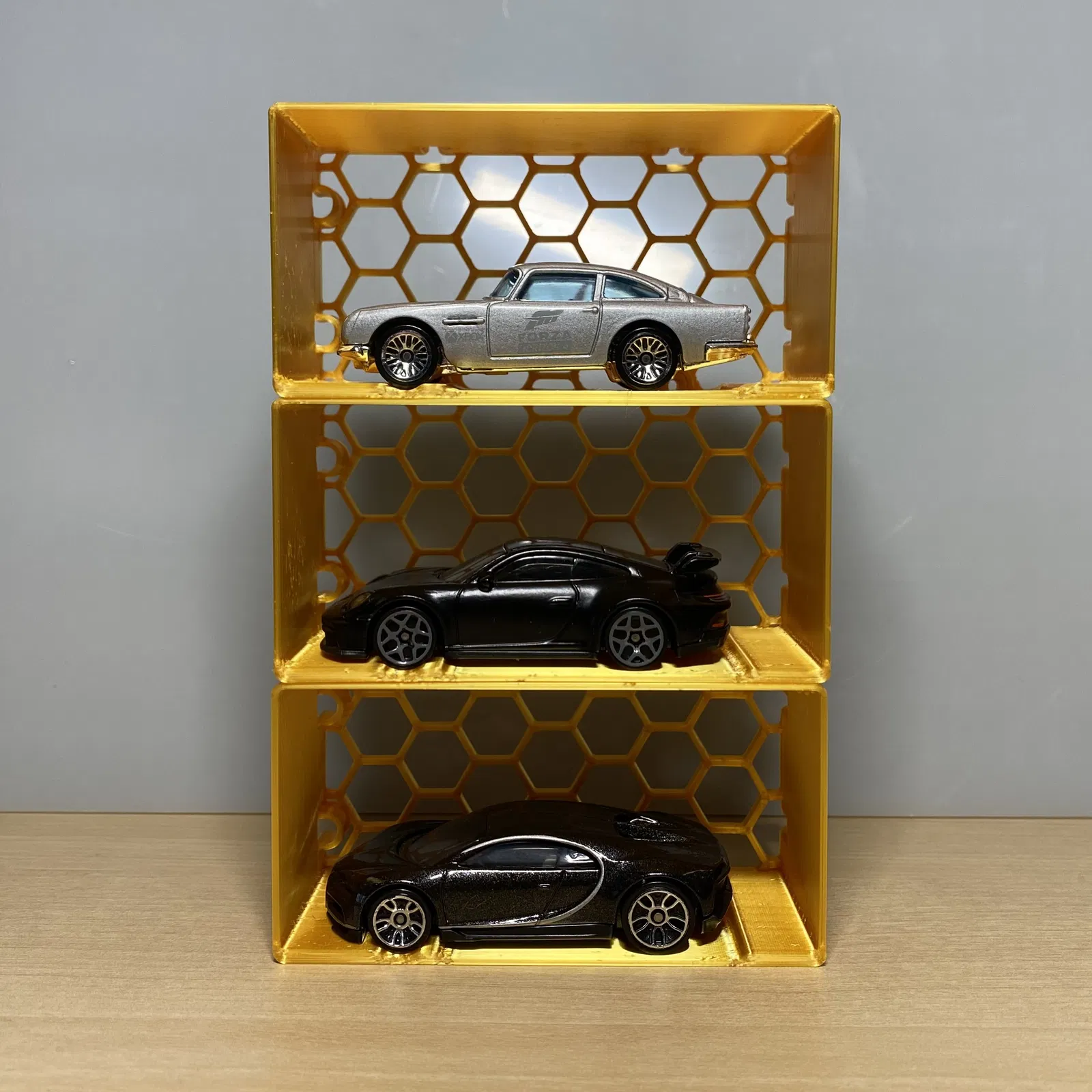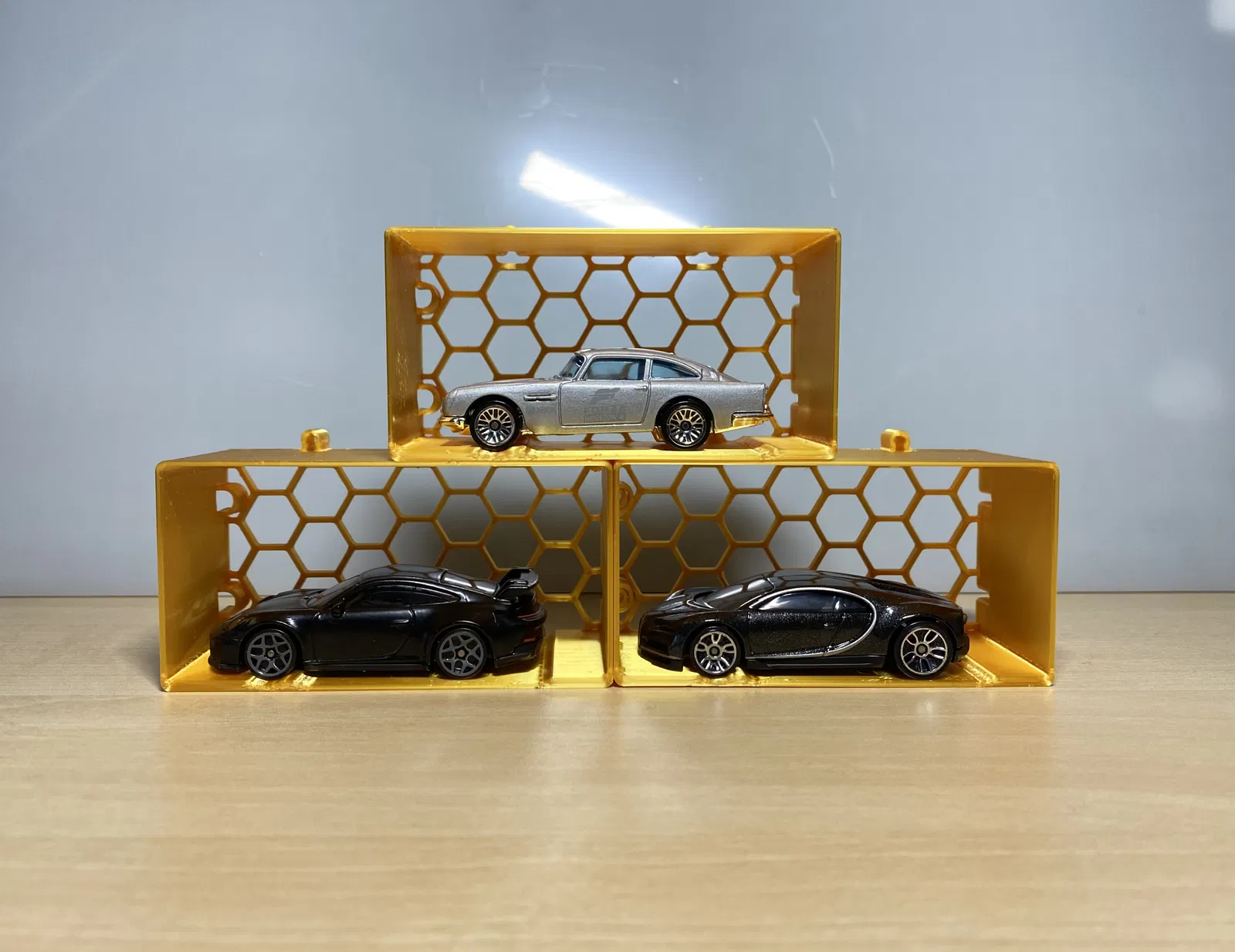 Kệ trưng bày xe mô hình HotWheels, MiniGT, Matchbox, Minichamps 1:64 theo dạng module, có thể kết nối tùy ý theo chiều dọc, ngang hoặc xếp chồng như gạch. Thiết kế lục giác độc đáo với nhiều tùy chọn mặt sau và khe cắm nhãn tiện lợi. In ấn dễ dàng, không cần tinh chỉnh nhiều.