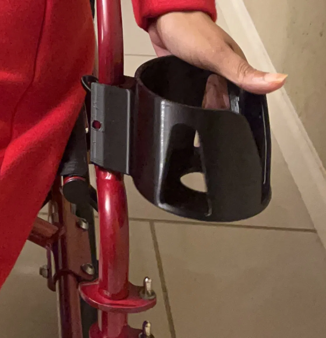 Giá đỡ điện thoại và cốc này gắn vừa cho mọi loại ống xe lăn/khung tập đi 3/4 lạng. Gắn vừa iPhone 14 Plus và các loại điện thoại tương đương. Thiết kế xoay tiện lợi, siết ốc để cố định. Ban đầu thiết kế cho xe lăn Medline.