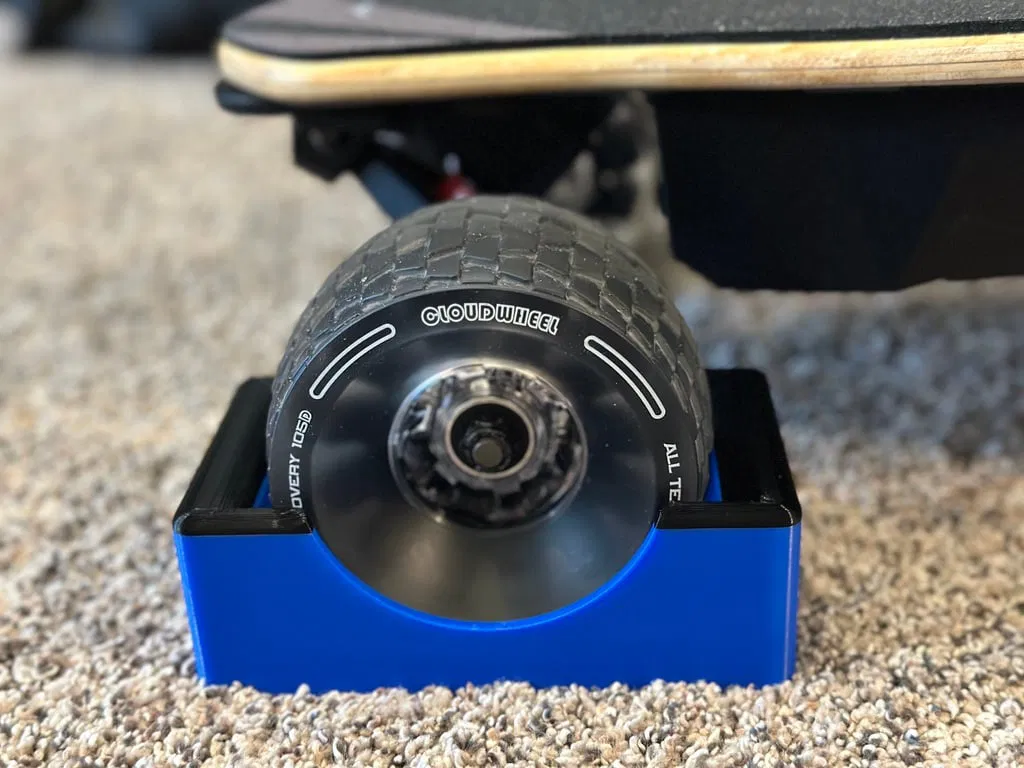 Mẫu này là cục chèn bánh xe (wheel chock) được thiết kế cho bánh xe Cloudwheel 105mm trên ván trượt điện, giúp bạn vận chuyển ván ở tư thế úp mặt lên mà không bị lăn.