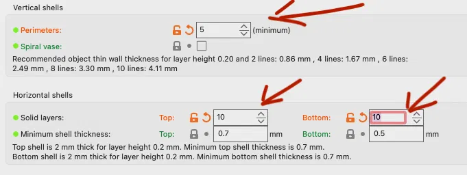 Nếu bạn định in mẫu này và bỏ bi vào, tôi khuyên bạn nên in với 0% infill và tăng số lớp vỏ (Perimeters/Vertical shells) lên 5 lớp để tăng độ cứng. Đồng thời, tăng số lớp đặc (Solid layers/Horizontal shells) ở cả trên và dưới. Tôi đã tăng lên 10 lớp (xem ảnh).