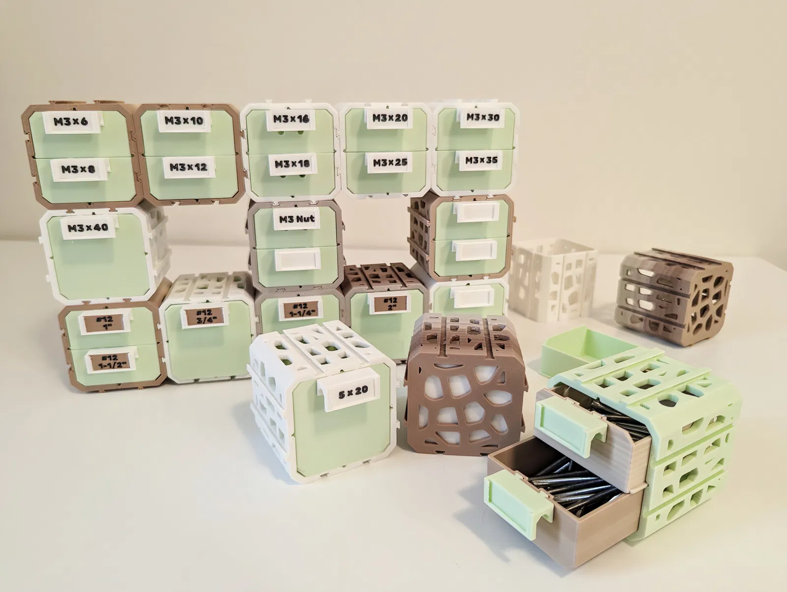 Tôi rất thích ý tưởng và thiết kế của ngăn kéo module E3D và thiết kế tay cầm từ hệ thống ngăn kéo Gridfinity. Tuy nhiên, tôi cần một bộ tổ chức hình khối nhỏ gọn hơn, có ngăn đựng nhãn tích hợp, phù hợp với màu gỗ và chủ đề tự nhiên của không gian làm việc. Do đó, tôi đã thiết kế một kệ hoa văn Voronoi tự nhiên, được tách biệt cẩn thận khỏi bất kỳ bộ phận chức năng nào nhưng có một hoa văn màu sắc thực sự đẹp mắt kết hợp với các ngăn kéo.