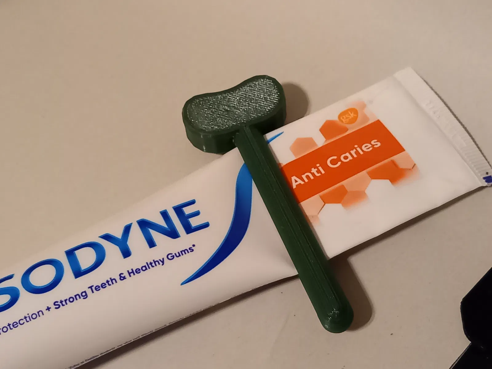 Cái dụng cụ bóp tuýp kem đánh răng đơn giản này, tui nhớ hồi còn nhỏ là có xài nè. In bằng PLA với ABS đều được hết, không cần support đâu. In ra dễ lắm luôn. Có hai bản tải về cho khỏi lằng nhằng, in càng dễ nữa.