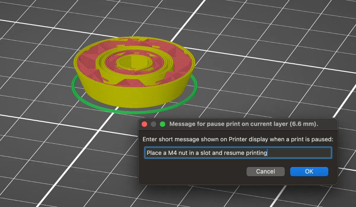 - Nếu bạn muốn nhét đai ốc M4 vào bên trong tay cầm, hãy tạm dừng in ở độ cao 6.6mm, đặt một đai ốc M4 vào, rồi tiếp tục in.