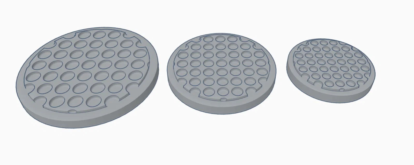 Mẫu đế lót mô hình có lỗ này có ba kích cỡ: 25mm, 32mm và 40mm. Hoàn hảo cho mọi loại wargame, bạn có thể in ở cài đặt tiêu chuẩn hoặc chi tiết hơn. Đây là vật dụng cần thiết để hoàn thiện các mô hình miniature của bạn, được thiết kế trên Tinkercad.