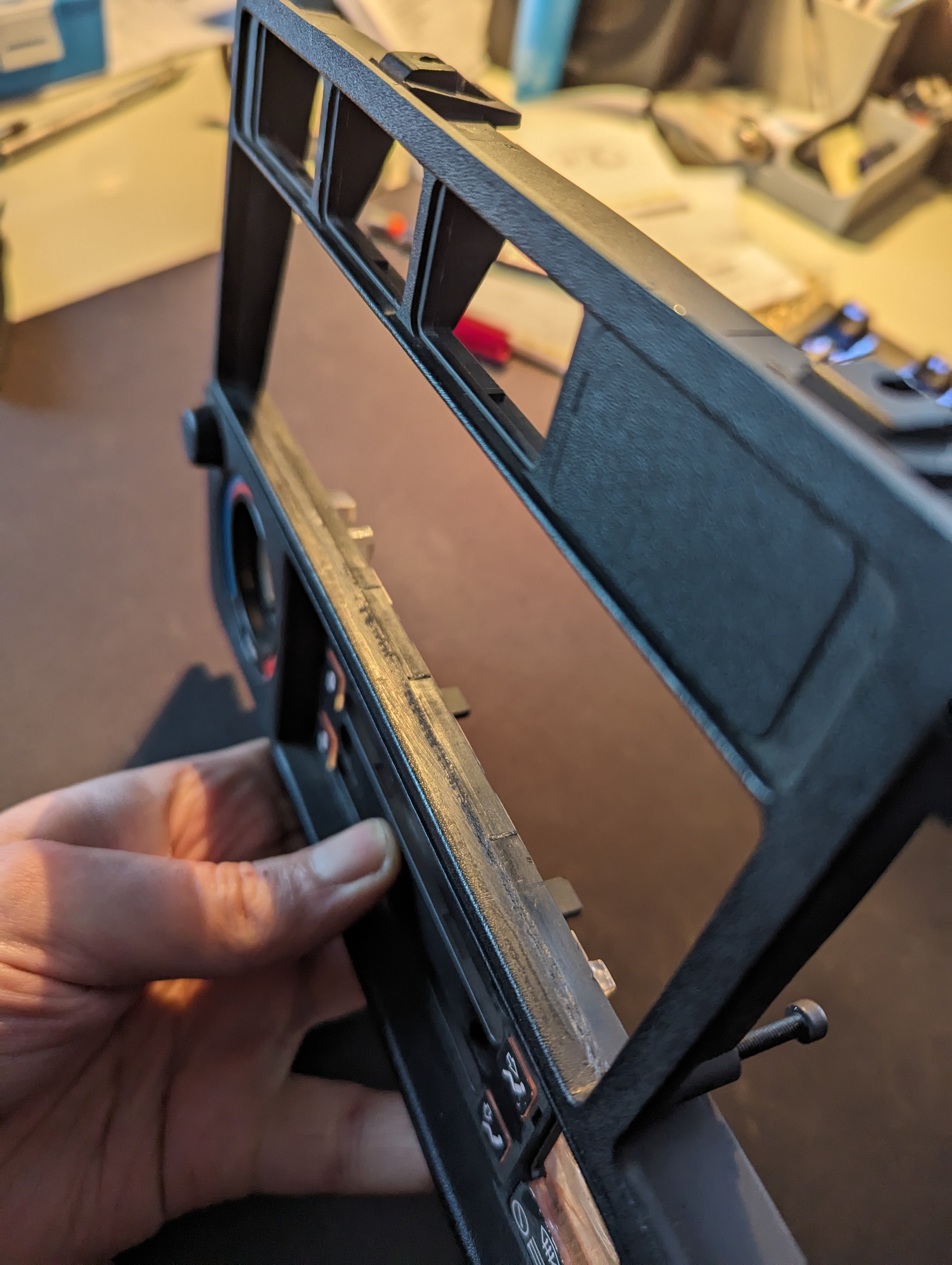 Bộ chuyển đổi khớp với các gân gia cố hiện có giữa hàng công tắc phía trên, nếu bạn muốn, bạn cũng có thể thêm keo ở đây. Tuy nhiên, chỉ cần dựa vào ba vít gắn là đủ (hai vít của OBC/đồng hồ và vít thứ ba của bộ điều khiển sưởi ấm, bạn sẽ cần một vít M3x8mm dài hơn một chút)