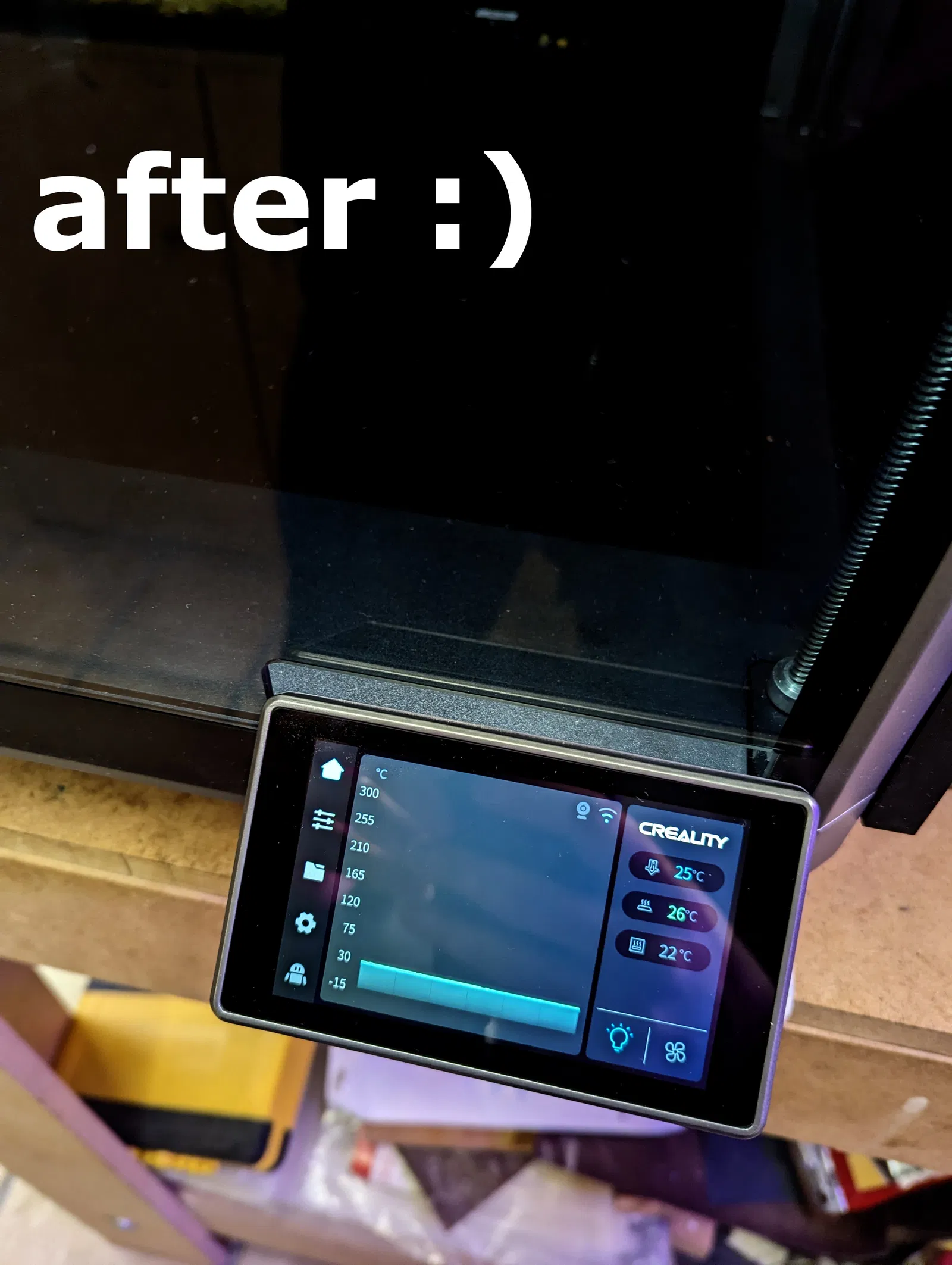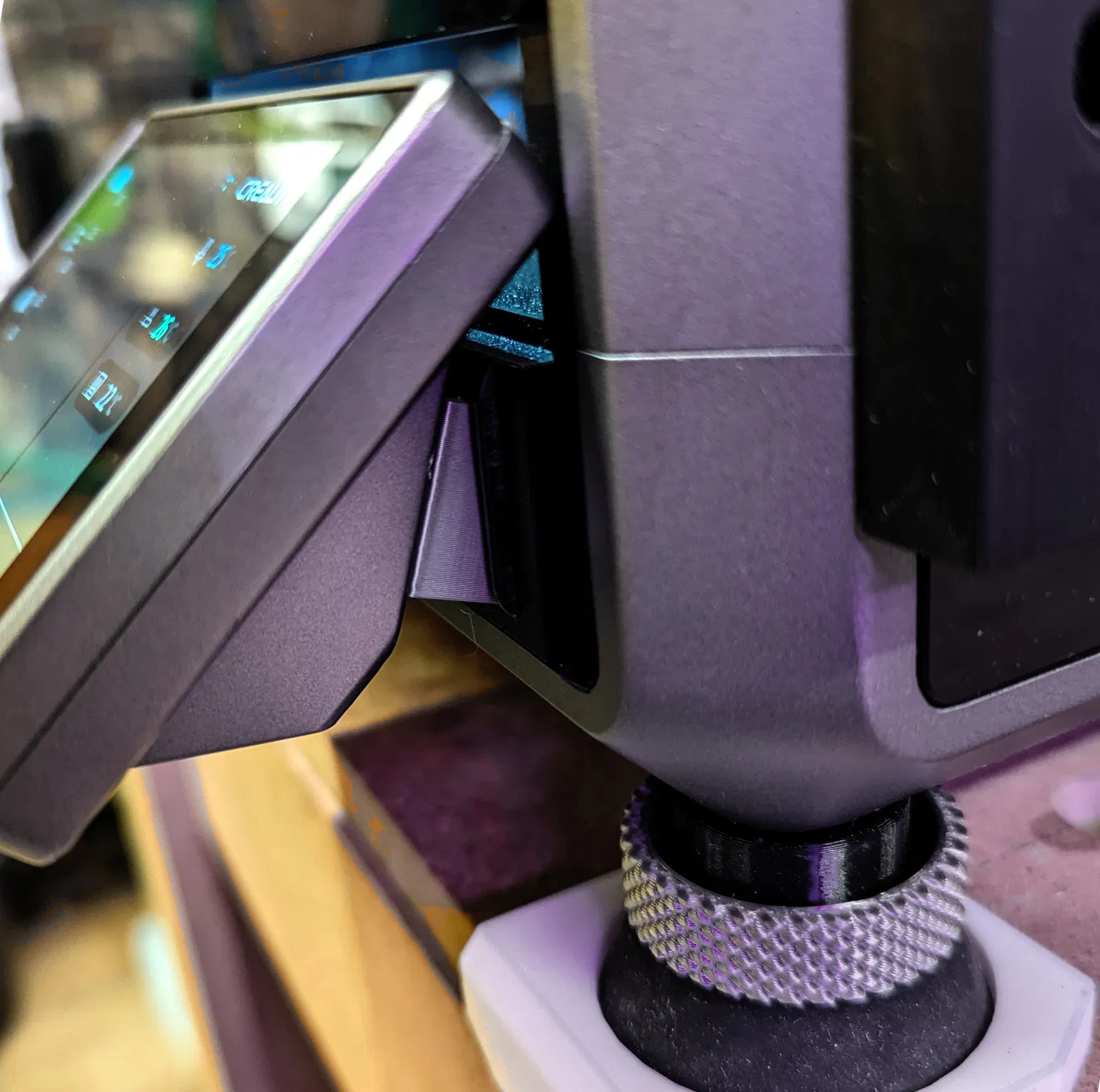 Do tui hay đứng gần máy in, với lại cái K1 Max tui cũng để trên cái bàn ko cao lắm, nên tui ko ưng cái góc nghiêng của cái màn hình. Thế là tui thiết kế cái món này để chỉnh góc nghiêng nó phẳng hơn khoảng 20 độ. Tui thấy ưng lắm, có thể anh em cũng xài được ha.