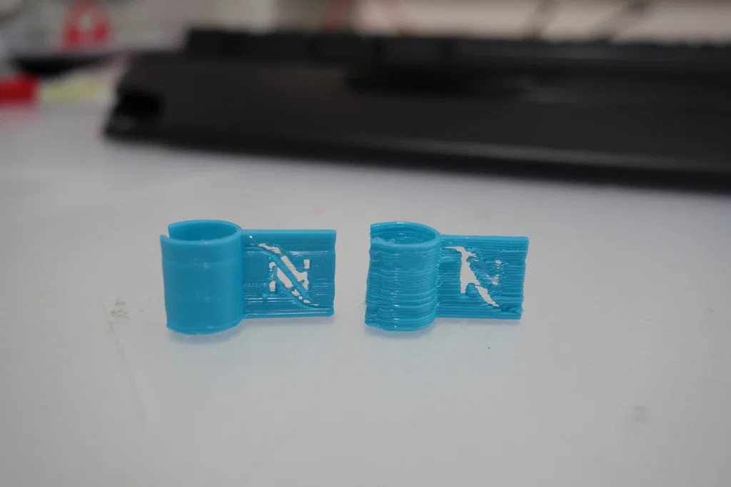 Tui vừa bổ sung thêm một bản in để so sánh. Cái bên trái in ở độ rộng đường 0.3mm, lớp in 0.12mm và cài đặt rút dây rất thấp. Cái bên phải là bản gốc in ở độ rộng đường 0.5mm, lớp in 0.32mm. Đây là bản in trực tiếp lấy ra khỏi bàn in trước khi xử lý hậu kỳ.