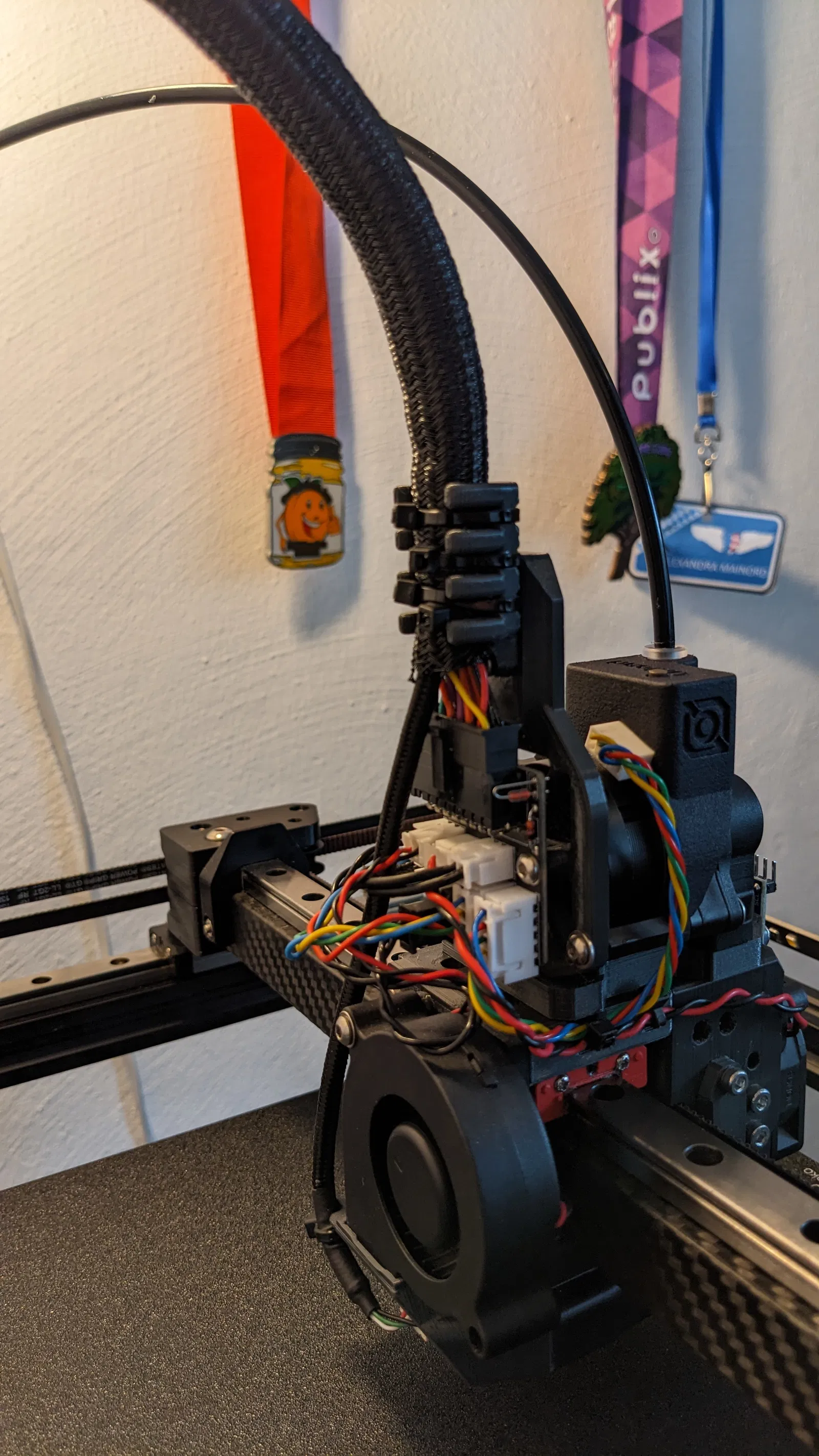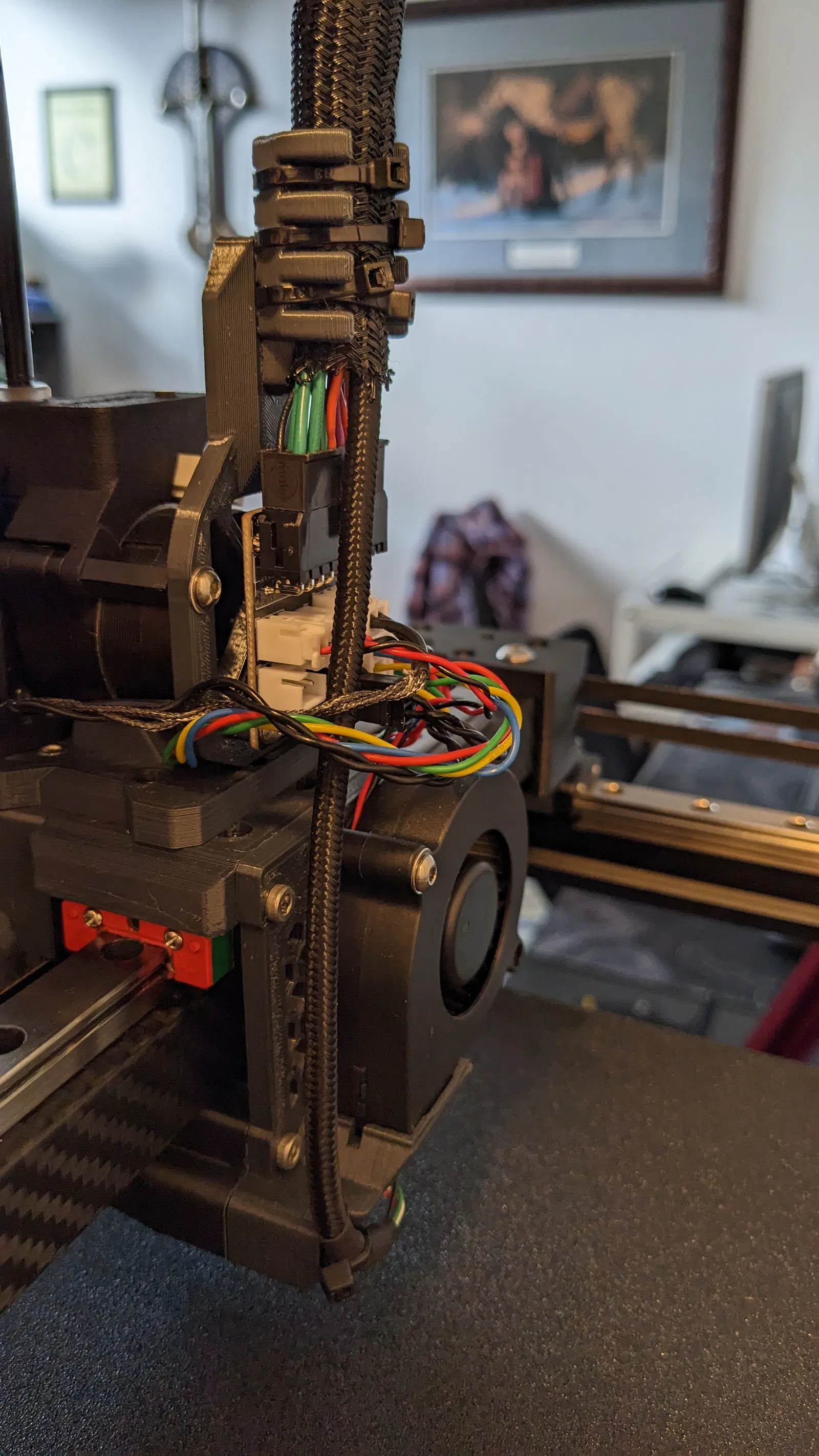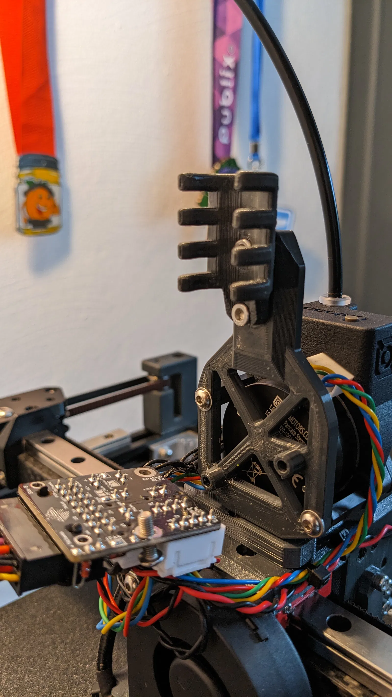 Tui mới lấy cái bo mạch đầu phun Annex Engineering Carabiner cùng bo mạch phân phối tương ứng và cần cái đế để gắn nó vô cái extruder Orbiter 2.0 của tui. Cái đế này gắn vô phía sau extruder, xài mấy cái trụ nylon hoặc đồng thau, cùng với mấy con ốc heatset m3 để gắn cái bo mạch và cái dẫn dây cáp.