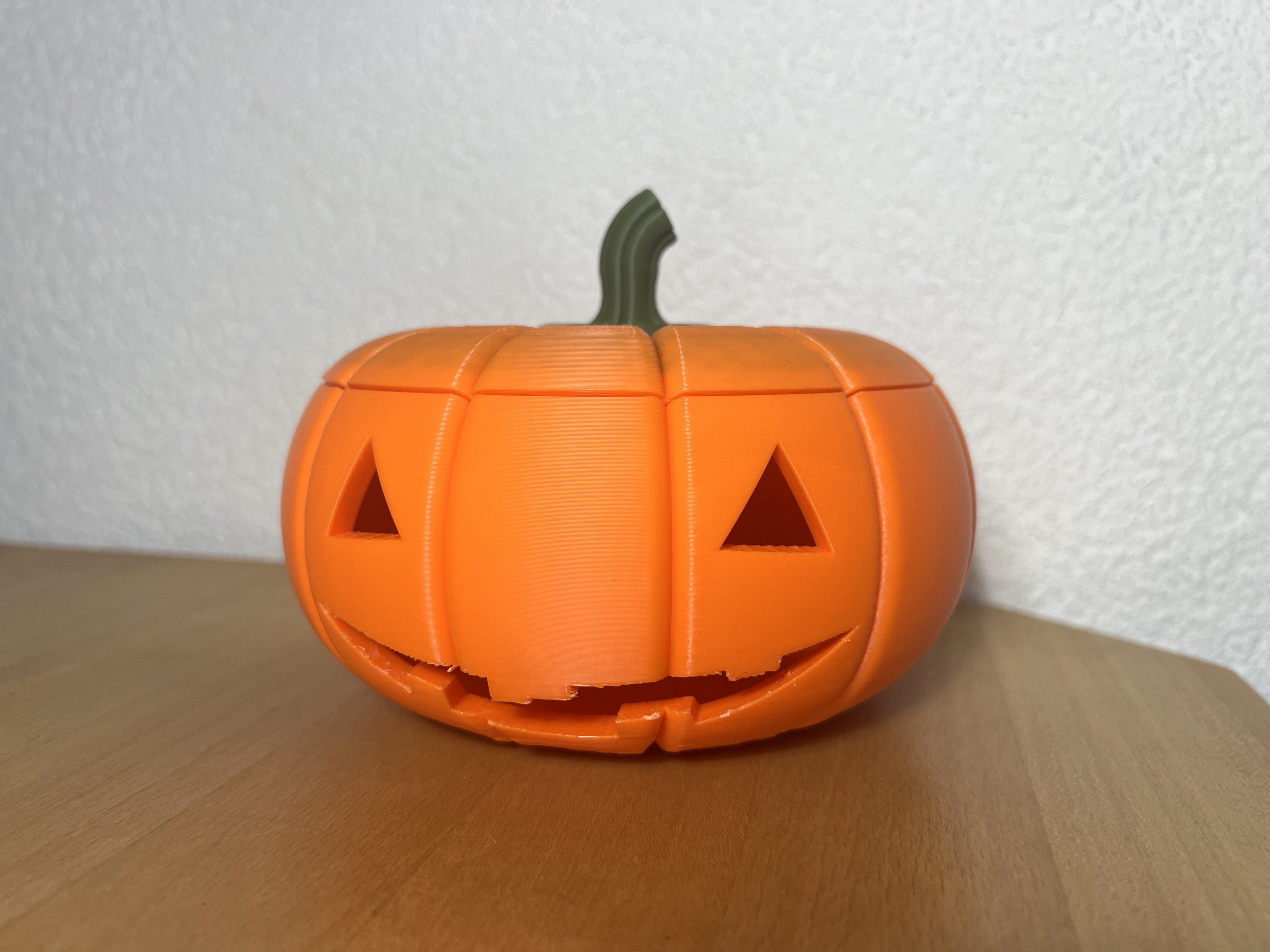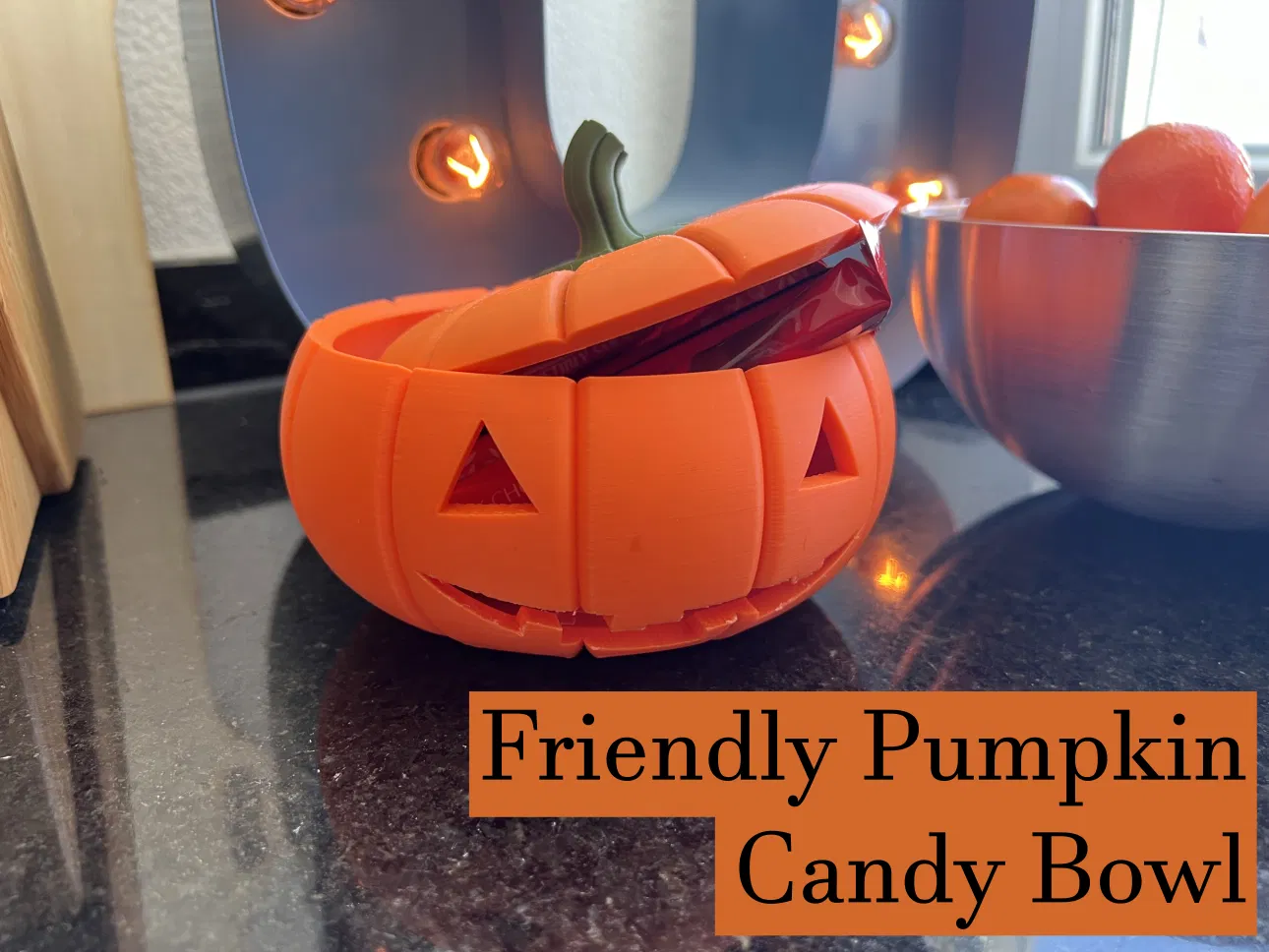 Tô đựng kẹo "Bí Ngô Thân Thiện" hình quả bí ngô dễ thương, tô và nắp in riêng. Kích thước 25cm (có thể thu nhỏ), sử dụng tệp STEP để có độ chính xác cao nhất. Hỗ trợ in đa màu với tệp .3mf.