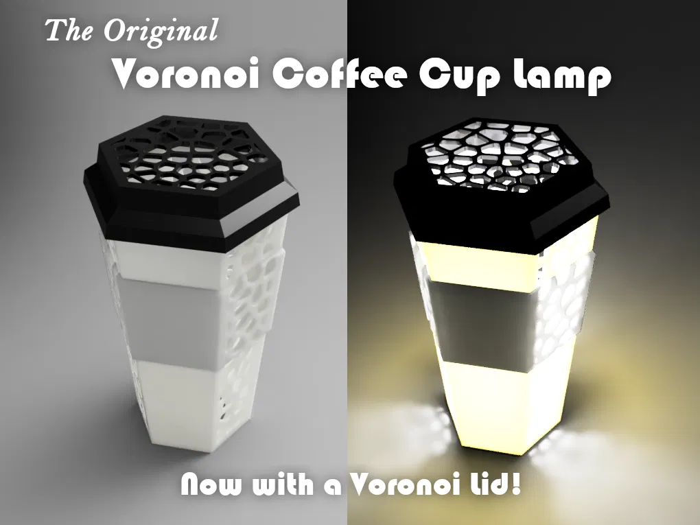 Thiết kế low poly nguyên bản của chiếc đèn này được làm để sử dụng đèn nháy (hoặc đèn fairy) làm nguồn sáng chính. Độ dày của thành là 2mm, với ba trong sáu mặt khoe ra các họa tiết Voronoi khác nhau. Nó được tạo phong cách theo một chiếc ly cà phê mang đi tiêu chuẩn 20oz, tương tự như những chiếc ở Starbucks và có 3 (hoặc 4) bộ phận. Kích thước: Khoảng 108mm đường kính x 180mm chiều cao (bao gồm cả đế). Có sẵn các tệp 3MF và STL.