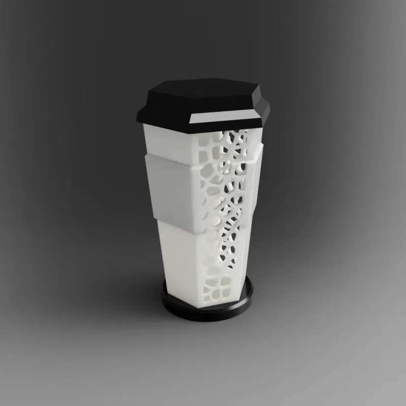 Khám phá đèn ly cà phê Voronoi độc đáo, lấy cảm hứng từ thiết kế low poly và họa tiết Voronoi. Hoàn hảo cho người yêu cà phê, sử dụng đèn nháy hoặc đèn LED. Có các tùy chọn ly, nắp và đế, file STL và 3MF sẵn có.