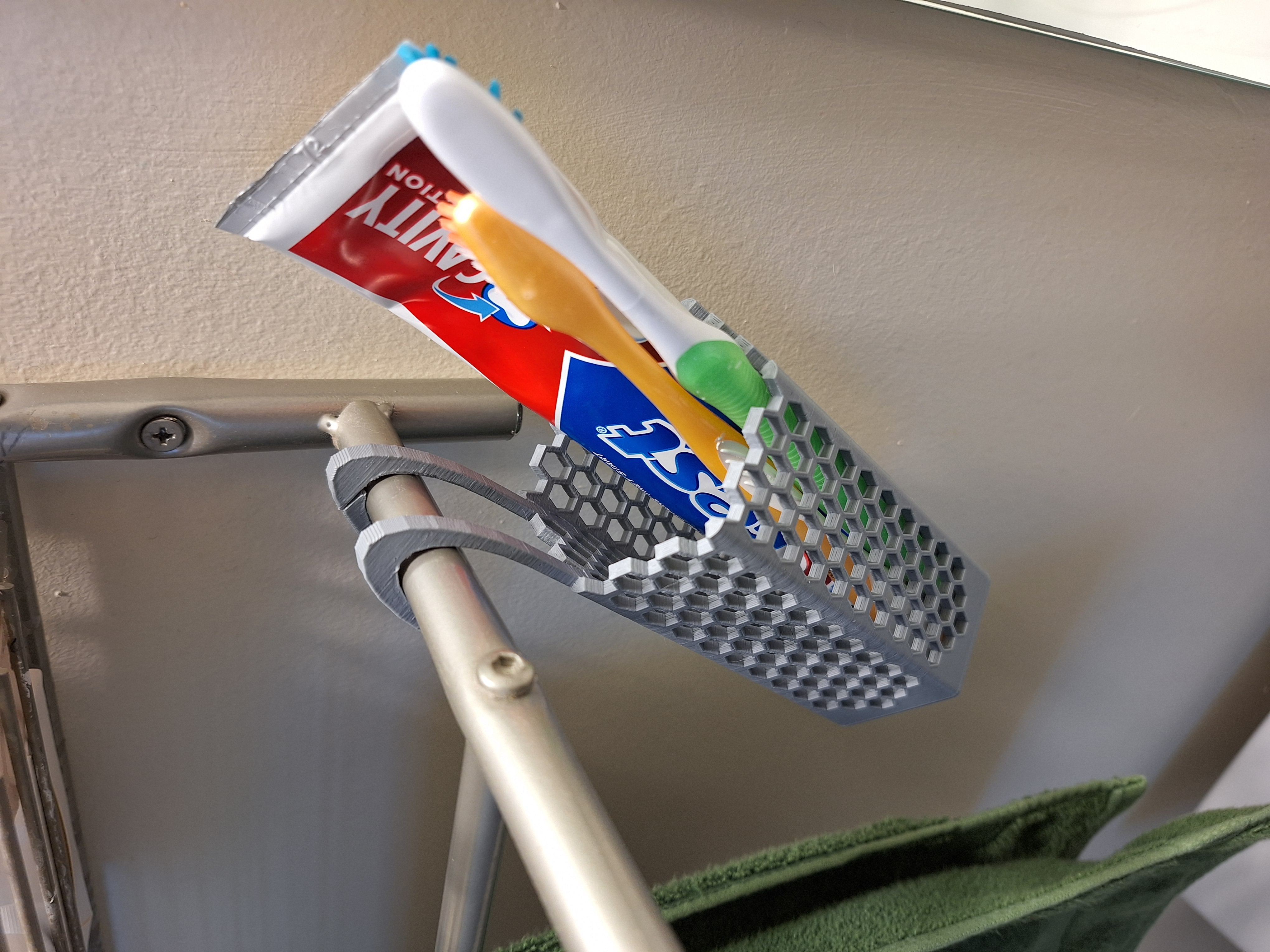 Cốc Lục Giác Treo này được thiết kế để treo trên thanh đỡ, tiện lợi để đựng bàn chải và kem đánh răng. Thiết kế hình lục giác giúp tránh đọng nước. Nên in phần Móc với độ điền đầy cao để tránh bị gãy.