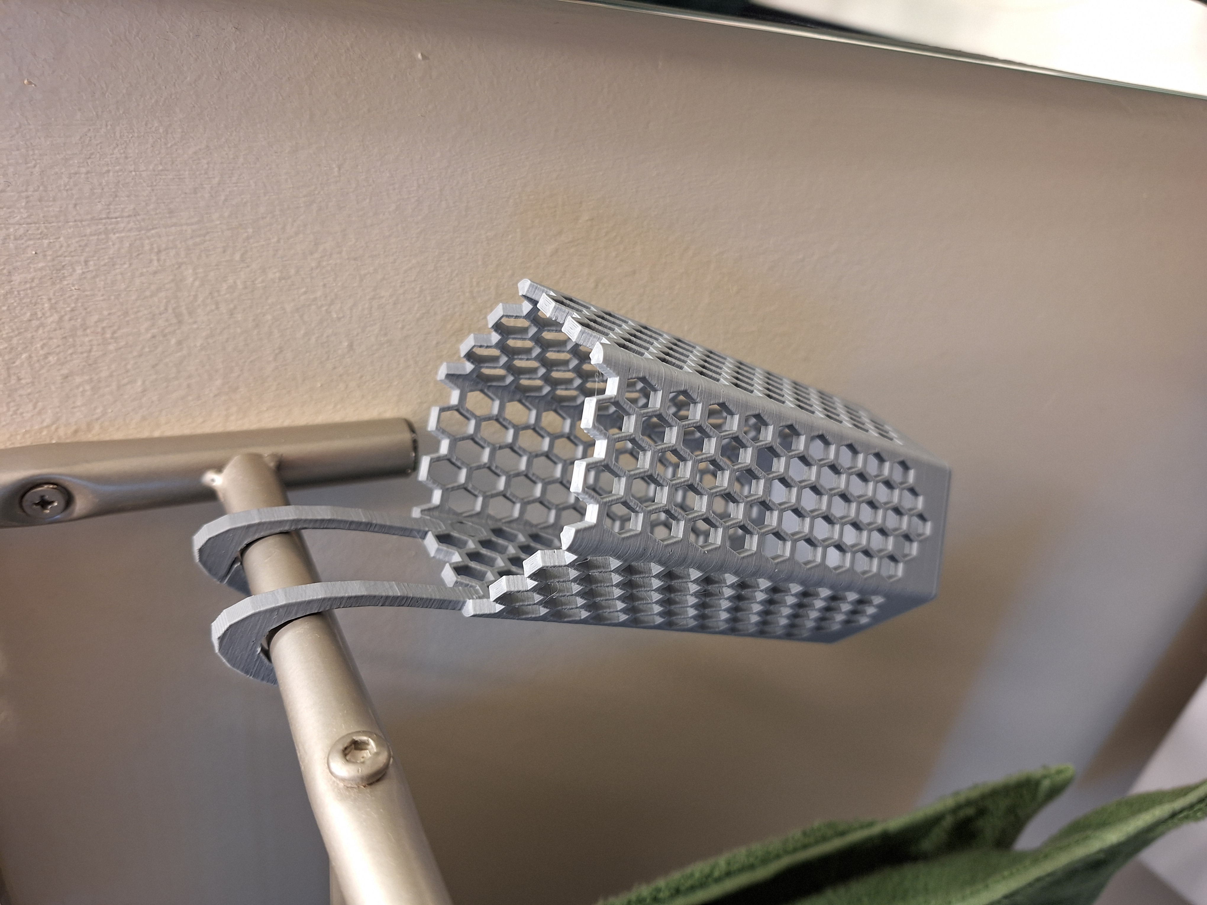Cái Cốc Hex Treo Này được thiết kế để treo trên thanh đỡ. Phòng tắm nhà tui có cái kệ nhưng làm bằng dây kẽm, nên việc để bàn chải với kem đánh răng hơi chông chênh, dễ bị rớt xuống. Vợ tui nhờ tui làm một cái gì đó có thể treo ở mép kệ dây kẽm đó để đựng bàn chải và kem đánh răng. Tui chọn thiết kế hình lục giác (hex) để đảm bảo nước không bị đọng lại.