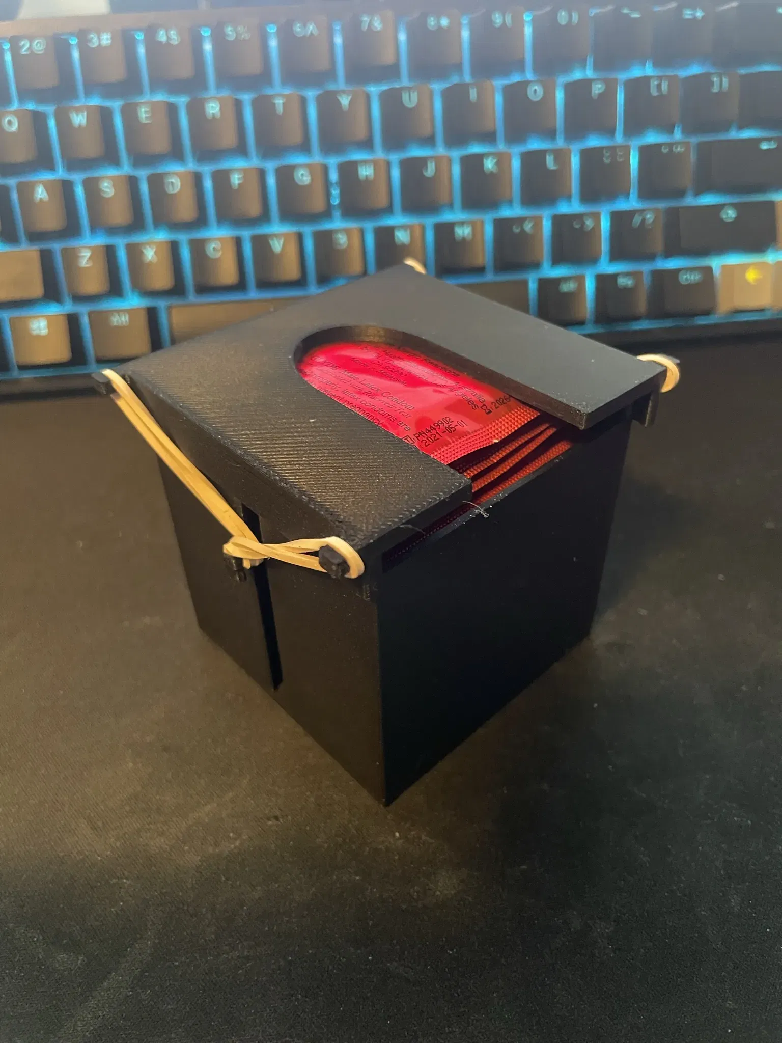 Nó chỉ là một cái hộp được chia thành 3 phần. Để lắp ráp, bạn sẽ cần 2 dây thun. Đặt nền tảng vào đáy, nạp nó bằng bao cao su, đậy nắp lại và kết nối nền tảng và nắp bằng dây thun, voilà, nó đã sẵn sàng để đặt lên bàn đêm của bạn.