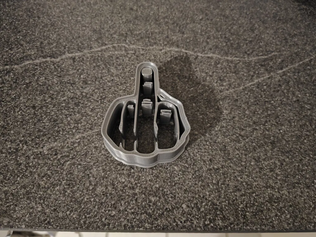 Cái khuôn cắt bánh hình ngón tay giữa này làm bánh của bạn độc đáo hơn bao giờ hết. Thích hợp cho mấy bữa tiệc tùng, sinh nhật, hay đơn giản là muốn tạo bất ngờ cho bạn bè. Làm từ nhựa an toàn cho thực phẩm, dễ sử dụng và vệ sinh. Tải về mẫu STL và in với PLA ngay!