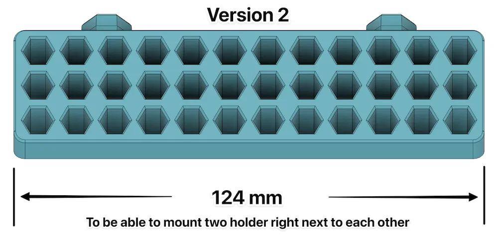 Cái kệ giữ mũi khoan Multiboard V2 này có thể chứa tới 36 mũi khoan. Phiên bản mới có chiều dài 124mm, cho phép bạn đặt hai kệ cạnh nhau để tiết kiệm không gian.