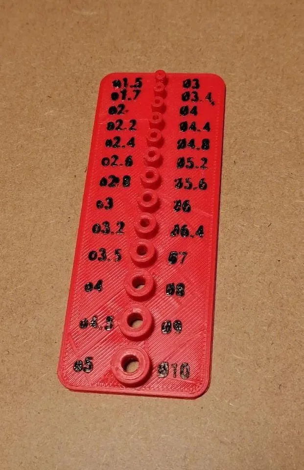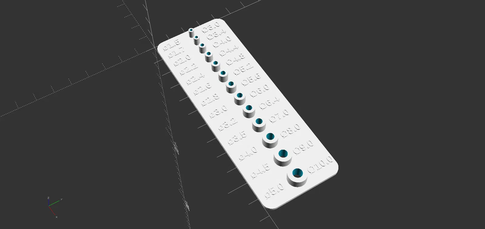 Đây là một khuôn mẫu hoặc thước kẻ đơn giản cho lỗ vít, có thể được sử dụng trong quá trình thiết kế để đảm bảo bạn dùng đúng loại ốc vít có kích thước phù hợp. Công cụ này giúp bạn dễ dàng tìm đường kính ốc vít chính xác khi thiết kế, và có thể tùy chỉnh theo nhu cầu của bạn bằng OpenSCAD.