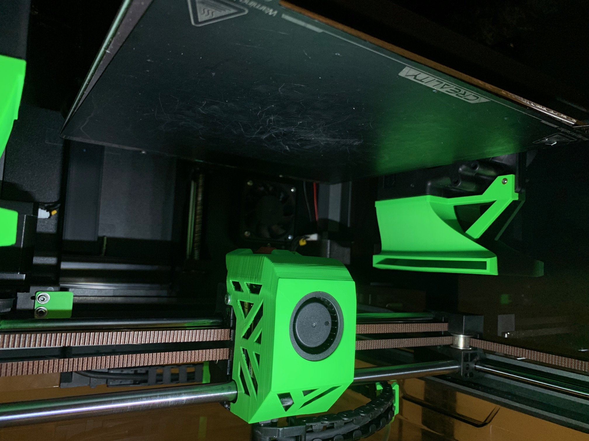 - Dễ lắp và tháo hơn cover zin nhờ có khoảng hở lớn hơn tổng thể (đặc biệt là giữa quạt và đầu nối bo mạch). Lưu ý: Bạn sẽ cần bật quạt khi in vật liệu chịu nhiệt cao, bao gồm cả lớp đầu tiên, để tránh làm cover bị quá nhiệt gần các đầu ra. Tui giữ quạt ở mức tối thiểu 10% khi in ABS ở 260°C cho extruder và 110°C cho bed. Mức quạt thấp hơn có thể cũng ổn nhưng 10% chưa từng gây ra vấn đề gì. Việc bật quạt không cần thiết với PLA, TPU, hoặc (rất có thể) PETG. Bạn có thể thấy nhiều ống dẫn bị cong vênh trong ảnh cuối cùng của album. Đó là do cố gắng loại bỏ vấn đề này. Đây là vấn đề dai dẳng và khó chịu nhất, và thật không may, việc bật quạt là giải pháp duy nhất tui tìm ra. Mặt khác, việc cố gắng loại bỏ vấn đề này đã dẫn đến nhiều cải tiến khác.