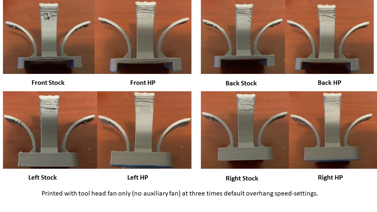 - Một file cho cả K1 và K1 max. Cái này cũng giúp dễ dàng tiếp cận cổng Lidar hơn trong trường hợp ai đó muốn làm bản remix có thêm đèn LED. Tính năng: Làm mát tốt hơn cover zin cho các chi tiết đúc (mọi hướng) và khi in các đoạn nối tiếp (bridging). Các bản in thử nghiệm bên dưới được in liên tiếp với cùng một file G-code. Sự khác biệt này nhất quán với nhiều bài test và các lần in thông thường. Bạn có thể cảm nhận được sự khác biệt về luồng khí bằng tay (và nhìn thấy nếu bạn muốn đặt một cốc nước bên dưới nó).
