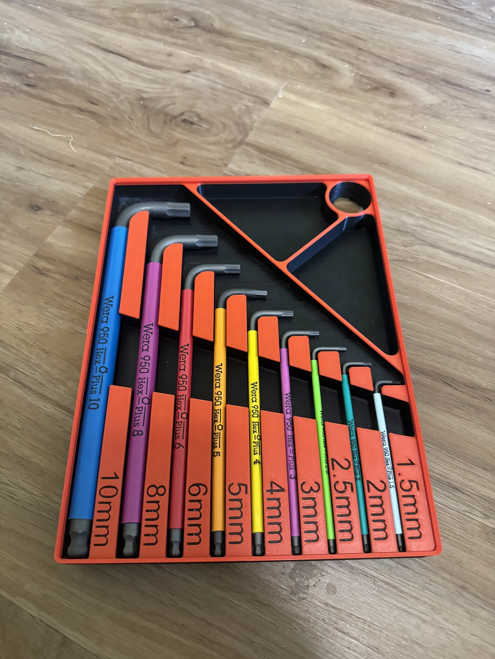 Dựng kệ đựng bộ lục giác metric Wera Hex+ theo chuẩn Gridfinity. Mô hình được thiết kế với lưới khổ nửa, tương thích hoàn toàn với hệ thống Gridfinity, cho phép đặt ở các khoảng cách tùy chỉnh. Kích thước tương đương 5.5x6 Gridfinity. Phiên bản này làm lại hoàn toàn, bo tròn các cạnh cho thẩm mỹ và an toàn hơn.