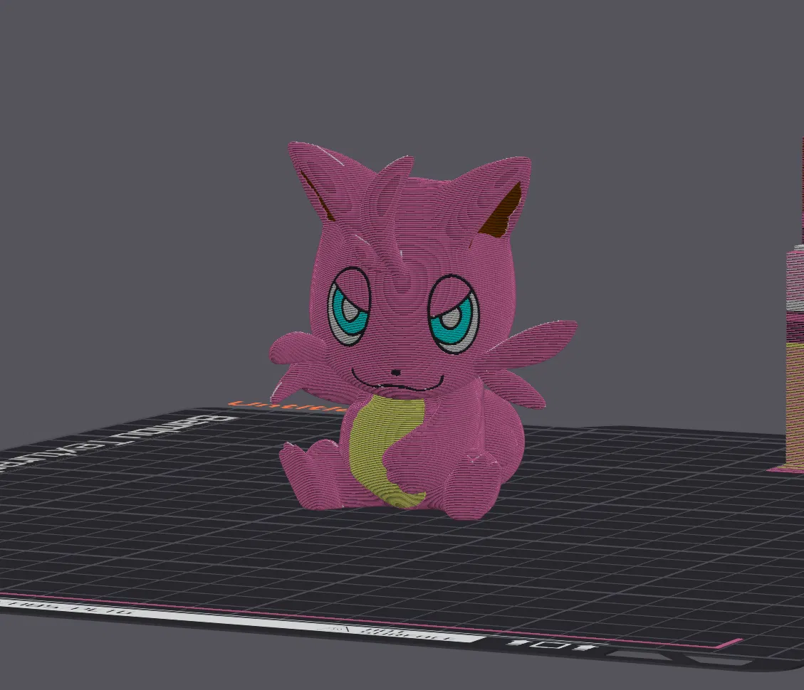 Phiên bản đã sơn màu của Cattiva Palworld, có thể in với máy in 4 hoặc 6 màu. Có 2 phiên bản: 1 cho AMS đơn với đổi màu, 1 cho 2 AMS. Cần support và lưu ý điều chỉnh khi thay đổi kích thước.