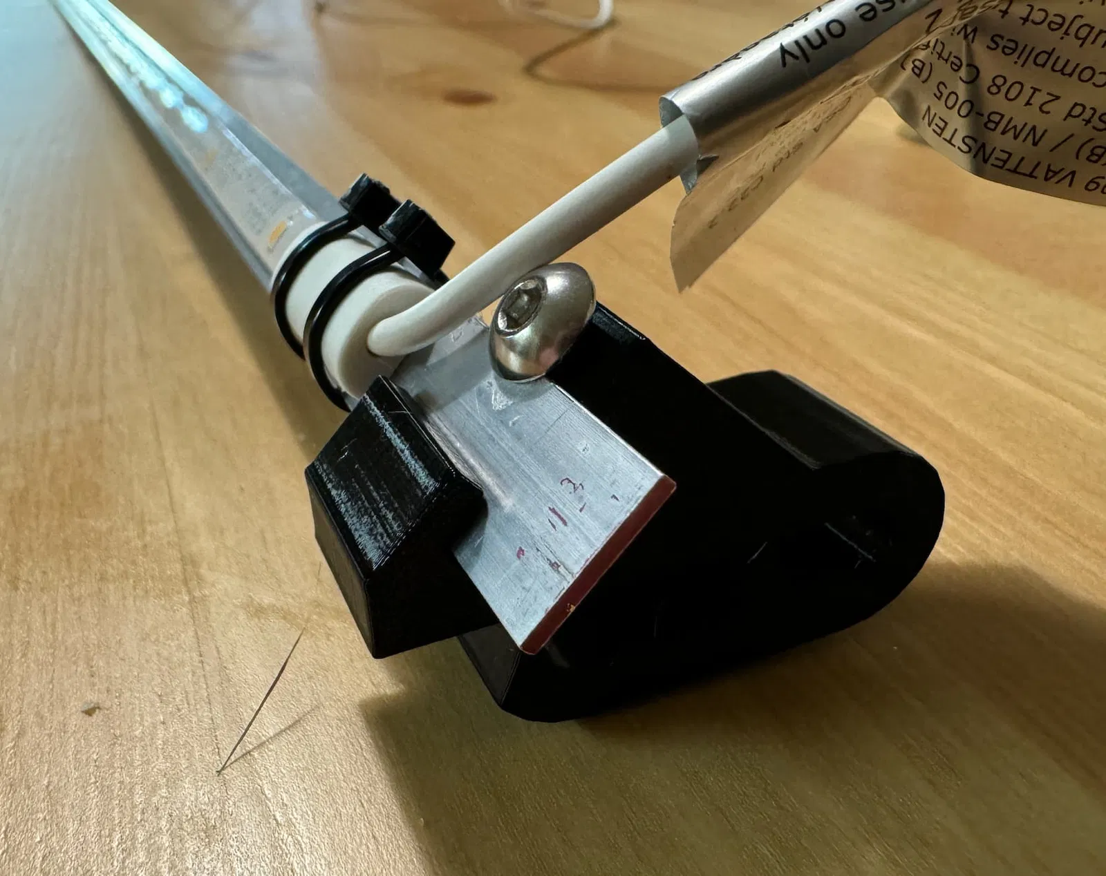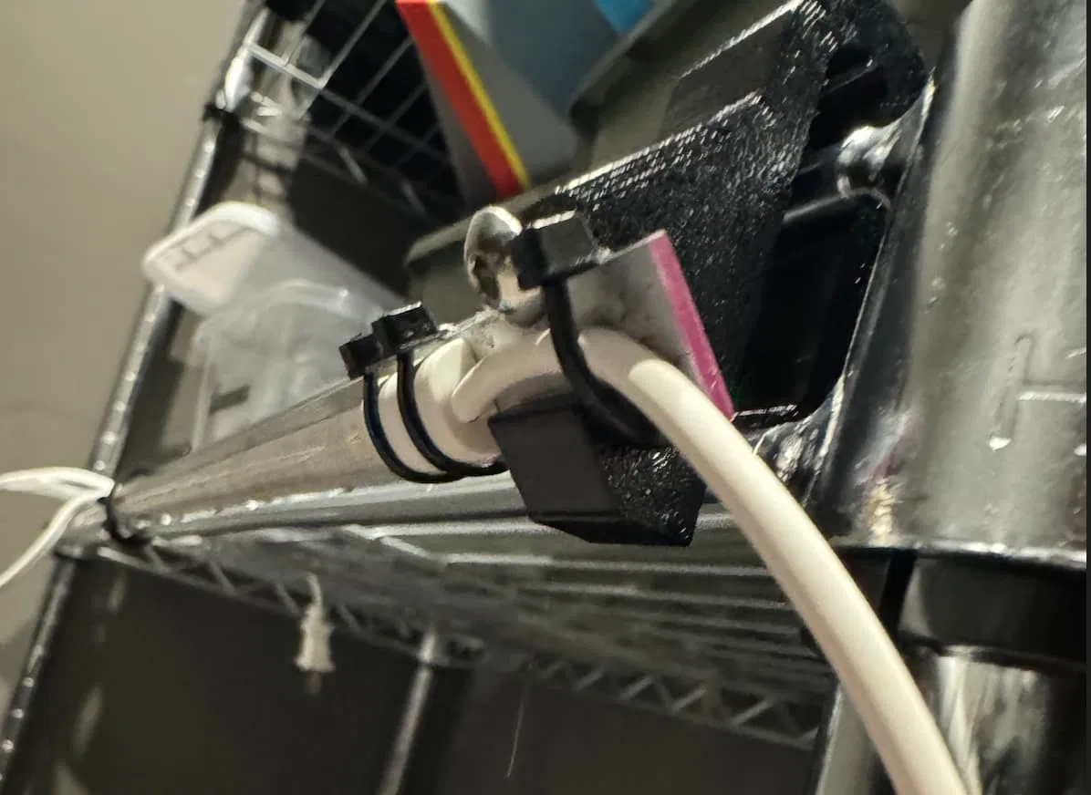 Tạo ánh sáng cho kệ lưới NSF bằng đèn LED Ikea Vattensten. Miếng nhôm có thể được cố định bằng ốc M5 hoặc dây rút. Đèn LED dán loại thường cũng dùng được.