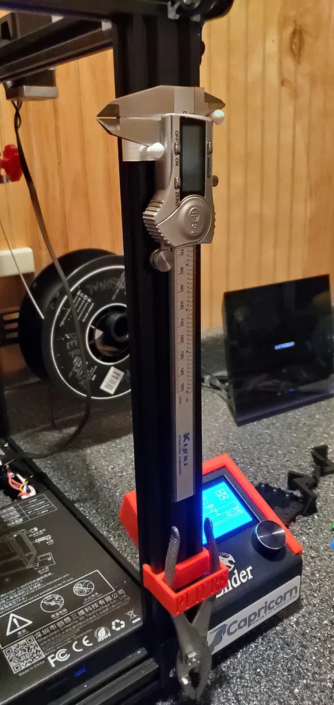 Máy in đầu tiên của tui là con Ender 5 Pro. Tui nhận ra cái khung hình hộp của máy in có nhiều chỗ để gắn thêm đồ lắm. Tui muốn có cái gì đó nhanh gọn lẹ để cất cái kềm kẹp số của tui nên nghĩ ra cái này. Tui làm cái trụ nó hơi xéo xéo để kềm kẹp nó treo thẳng băng luôn. Tui in bằng nhựa PLA và phải xài đế đỡ cho mấy cái trụ đó. Sau một thời gian tui thấy cái nhựa PLA nó cứ hơi bị 'nhão' rồi trượt xuống thanh nhôm. Tui dán thêm một miếng mút cao su tròn nhỏ phía sau cái đế đỡ, vậy là hết bị trượt luôn.