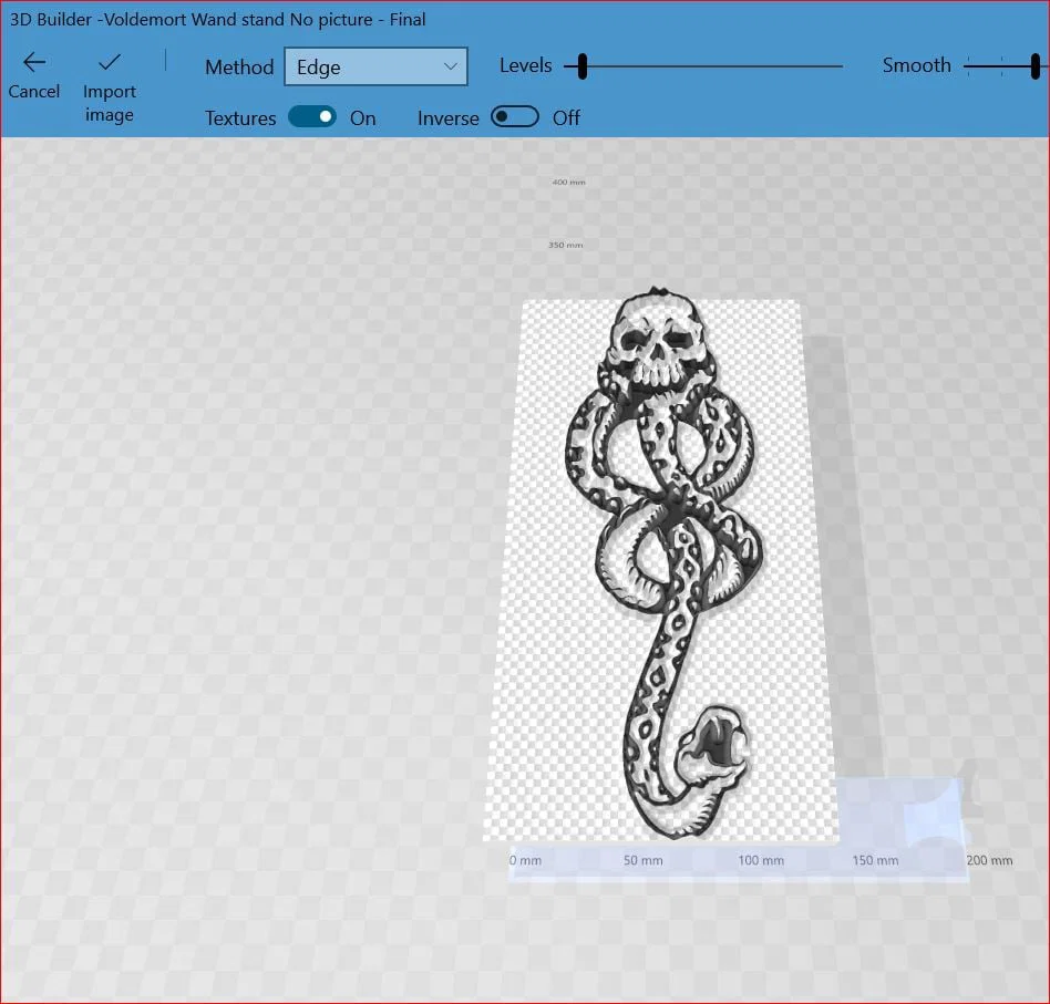Muốn làm cái gì đó "Hắc Ám" để cắm đũa phép Voldemort, nên chỉnh sửa lại bản gốc. Làm dài hơn, tay không đều, thêm Dấu Ấn Hắc Ám. In với nhựa PLA xám, không cần supports.
