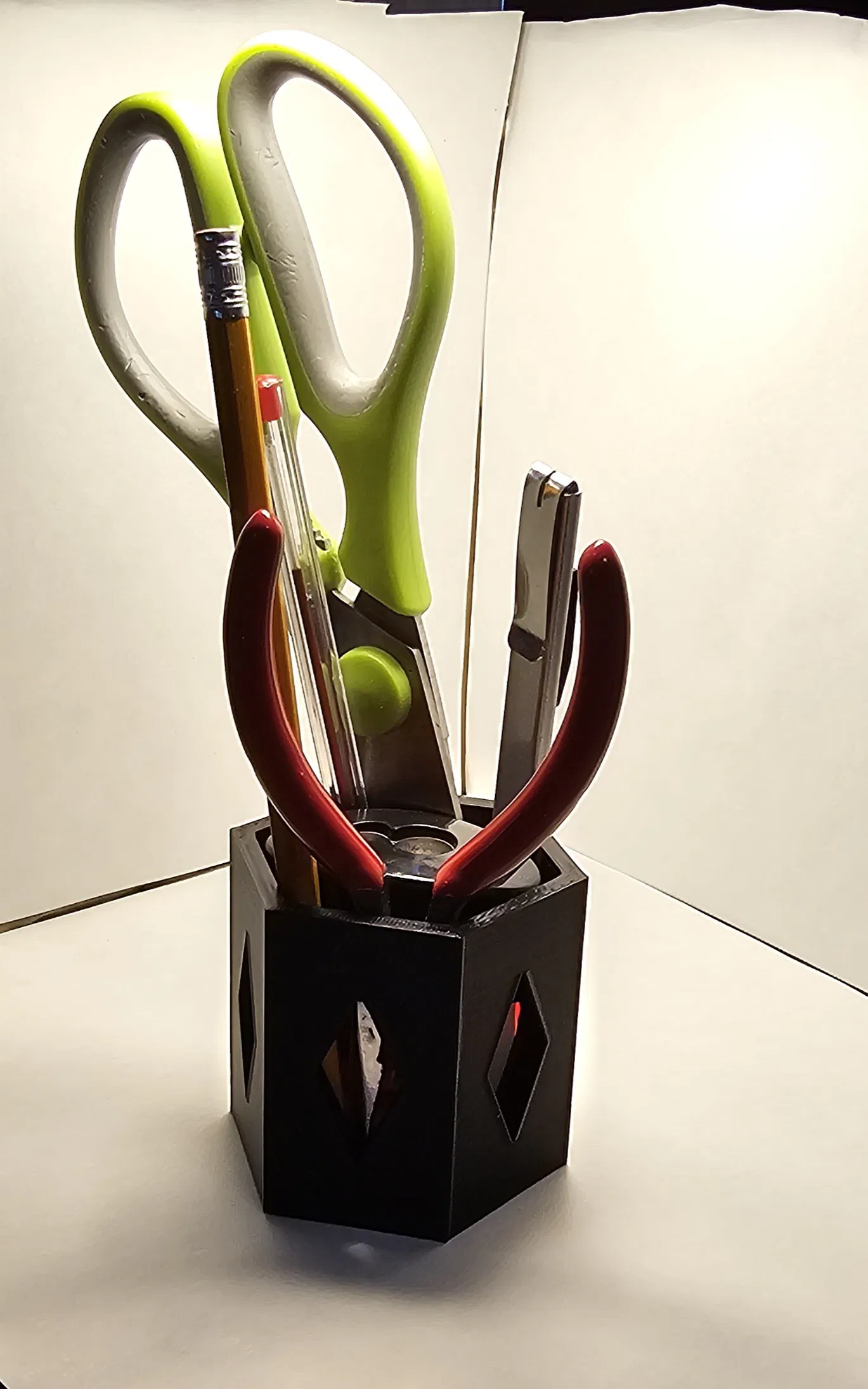 Đây là một cái đế nhỏ gọn dùng để đựng dụng cụ và bút chì, thích hợp cho những vật dụng như tua vít, kéo, bút và những thứ tương tự.