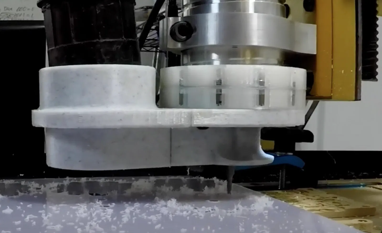 Bộ thu bụi gắn trên cao dành cho CNC, dùng với máy hút bụi Rigid và Trục chính DeWalt 611 (Amazon), có nhãn "JSCook-DC0" để chỉ đây là phiên bản "0" ban đầu.