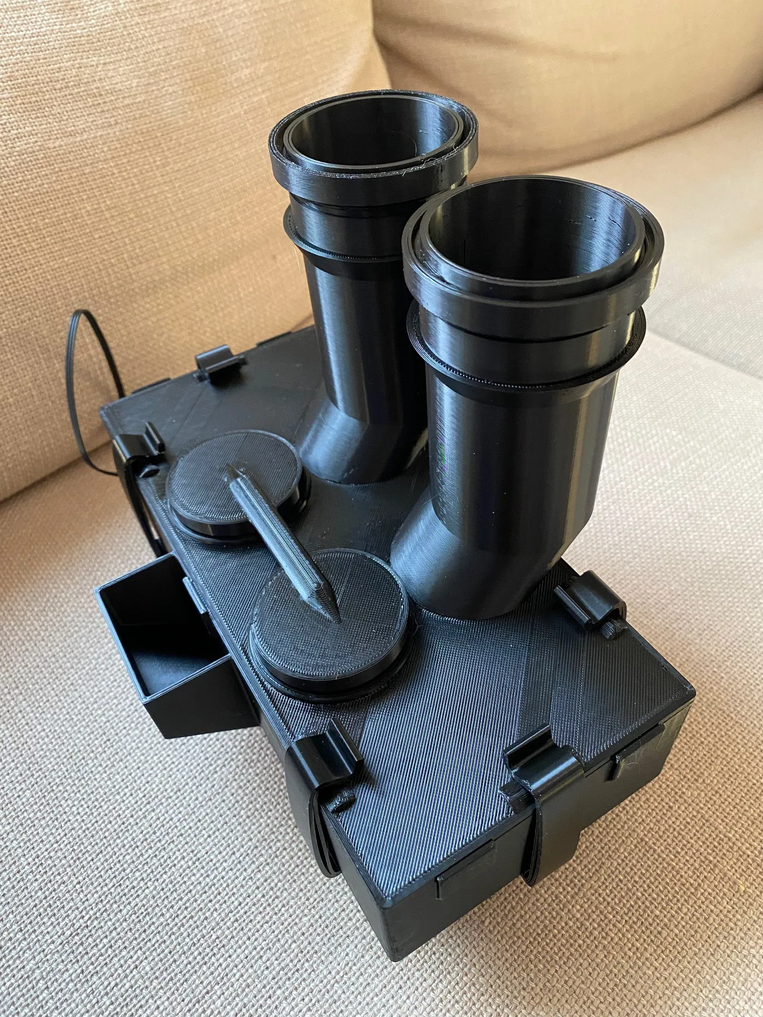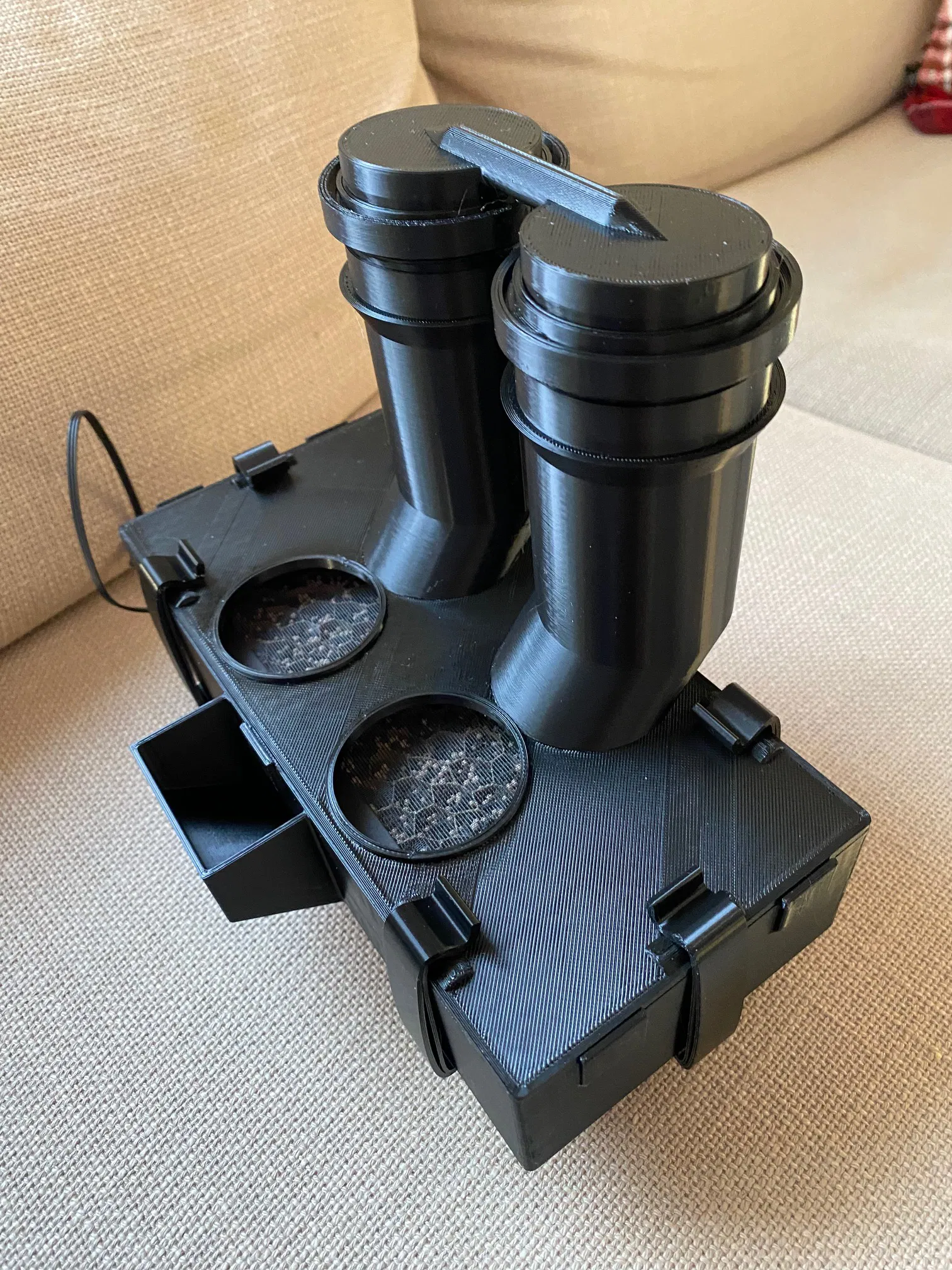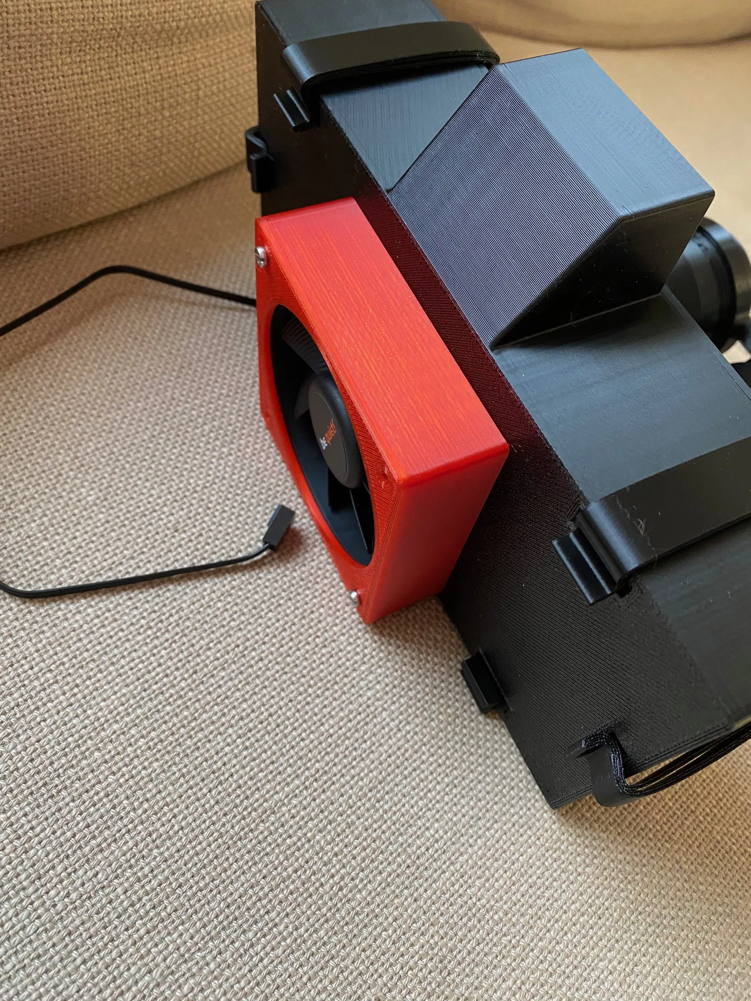 Có thể dùng với bất kỳ vỏ máy nào phù hợp bằng cách tạo các lỗ cần thiết, nhưng được thiết kế để lắp vào vỏ máy này: Tôi đã điều chỉnh các tấm trên của Amazon62 trong bản phối lại này để tạo lỗ thoát khí và gắn giá đỡ bộ lọc. Các tấm này không đi kèm với mẫu này và phải được tải xuống riêng. Giá đỡ bộ lọc sử dụng bộ lọc thay thế từ Qlima A45 (https://www.qlima.com/assortment/accessories/active-carbon-hepa-filter-qlima-a45-1-set-=-4-pcs/) Quạt 80mm vừa với các lỗ. Nắp quạt được làm cho quạt dày tiêu chuẩn 25mm. Nắp quạt không thực sự cần thiết cho chức năng, chỉ để trang trí. Có chỗ cho quạt dày hơn. Cần bốn vít M3x35 cho quạt (nếu dày 25mm). Việc chuyển từ tuần hoàn sang xả có thể được thực hiện bằng cách di chuyển các nút cắm từ lỗ bên ngoài sang lỗ bên trong. Phần dưới của giá đỡ có hai phiên bản, trong đó một phiên bản có túi đựng cảm biến cân bàn. Hai bộ phận cần in nhiều lần được gắn thẻ với số lượng cần thiết trong tên. Không cần hỗ trợ cho bất kỳ bộ phận nào, ngoại trừ nút cắm, phần giữa có thể cần hỗ trợ từ bàn in. Quạt nên có nắp che để tránh các sợi dây tóc bị cuốn vào quạt khi đầu in di chuyển lên sau khi in. In nắp quạt mới đòi hỏi lớp in đầu tiên tốt và tốc độ chậm cho vài lớp đầu, vì lưới có các bộ phận chỉ rộng 3mm. Để gắn bộ chuyển đổi buck / bộ chuyển đổi bước xuống 24v sang 12v, có thể sử dụng đầu nối PCB sau: