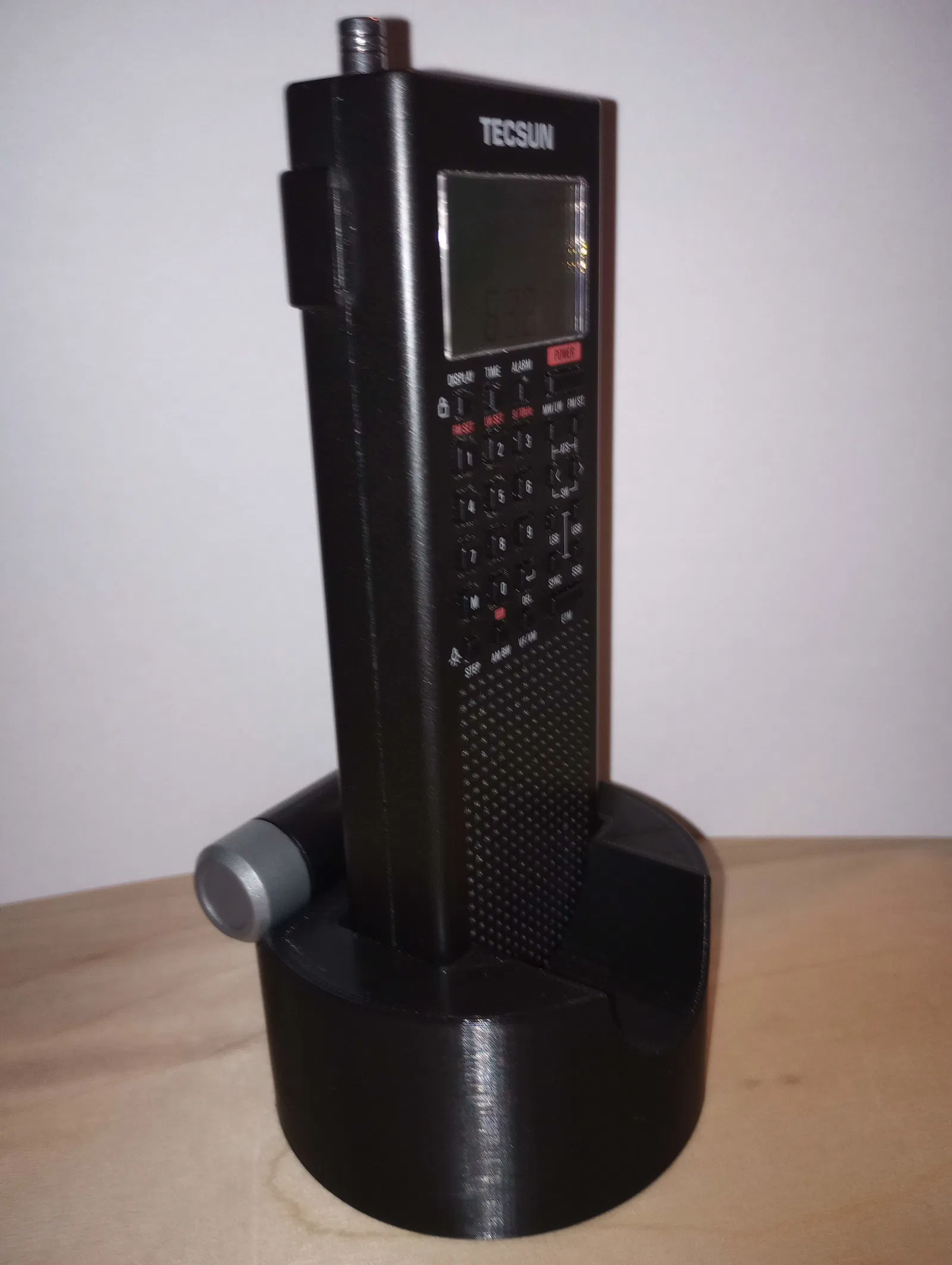 Chân đế dạng puck cho radio Tecsun PL-368 hoặc County Comm GP-7. Thiết kế có phần cắt thấp phía trước và chỗ cất ăng-ten T. In bằng PLA Pro, không cần hỗ trợ cho bản thường.