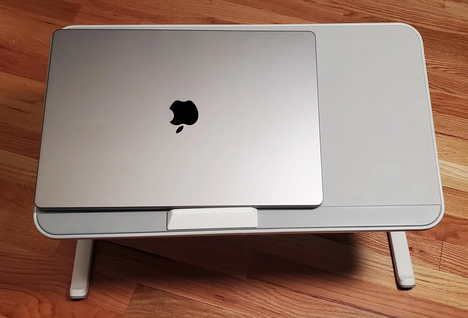 Đây là một bộ chặn cố định, mỏng nhẹ dành cho các loại kệ/khay đựng laptop đang bán trên thị trường với nhiều tên thương hiệu khác nhau, thường có bộ chặn có thể điều chỉnh và tháo rời. Cái kệ của mình (tên là “SAIJI Leather Adjustable Laptop Bed Tray Table with Removable Stopper, Portable Lap Desks with Foldable Legs, Breakfast Reading Notebook Stand for Sofa Couch”) bắt đầu bị rơi ra hàng ngày sau một thời gian sử dụng. Nhưng ngay cả trước đó, nó đã quá dày so với cái laptop (vốn đã dày) và cũng quá rộng, gây khó khăn khi gõ phím bằng hai tay.