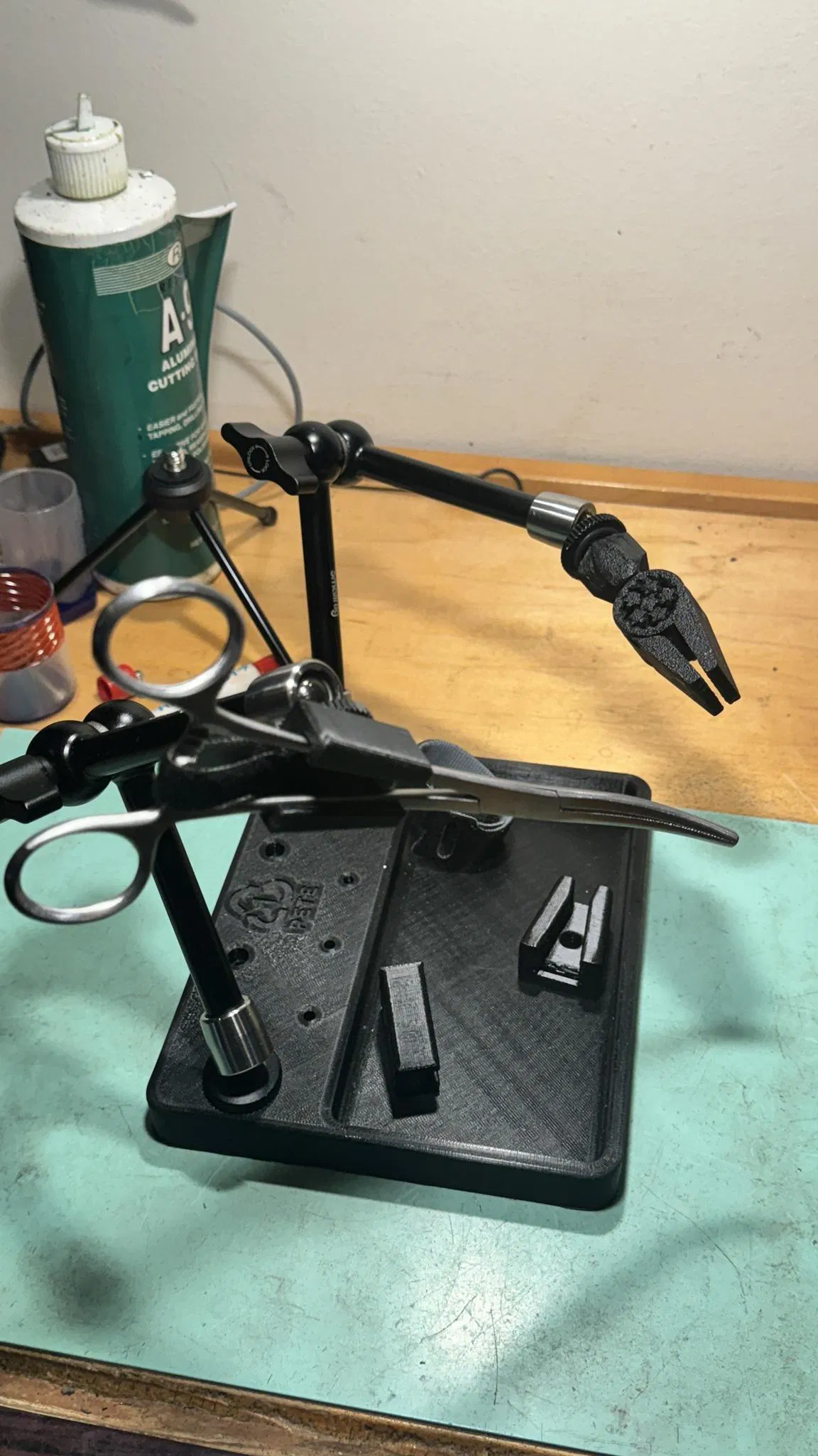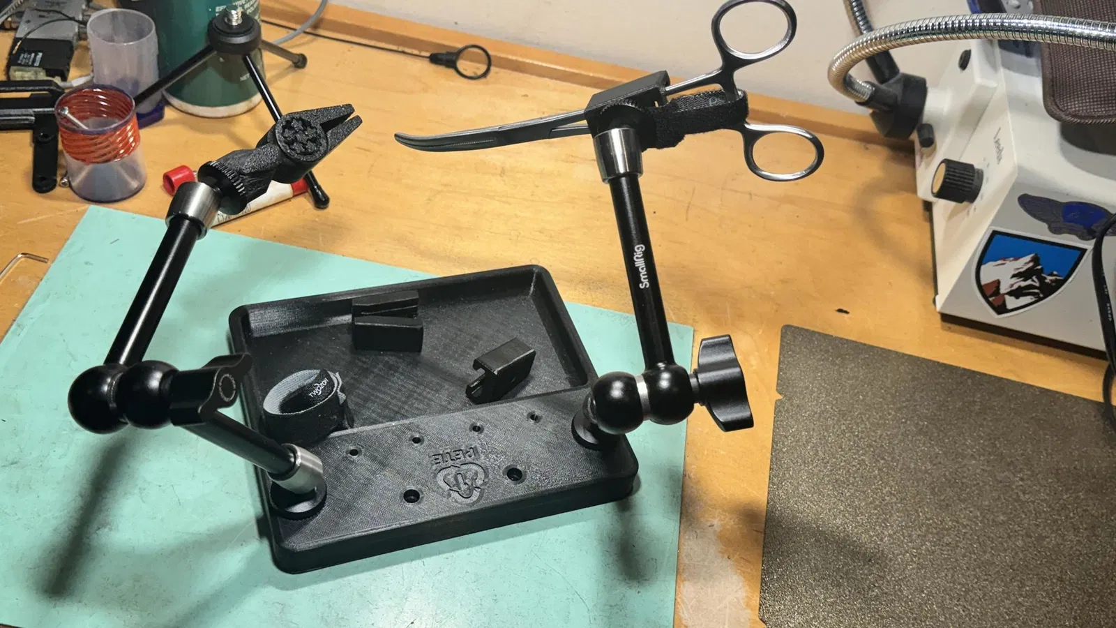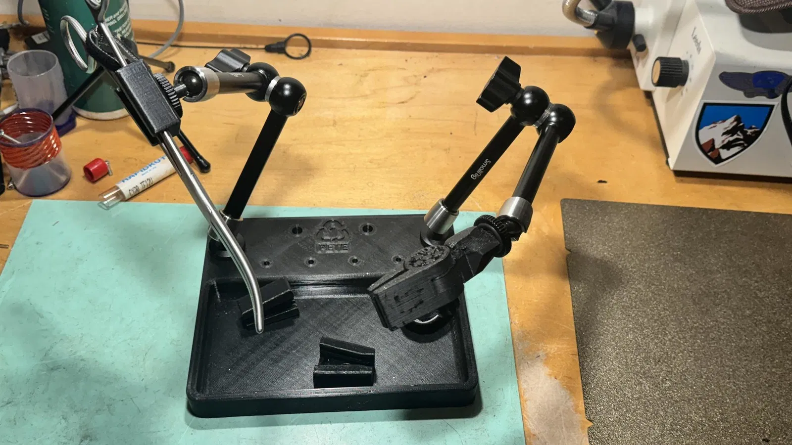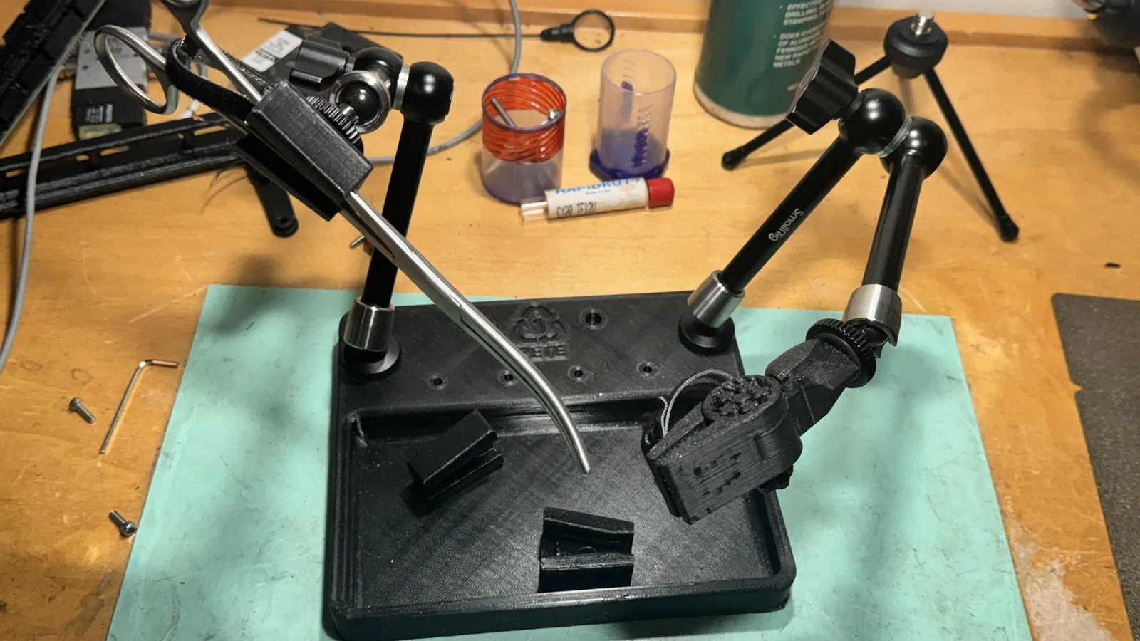 Thiết kế này ban đầu dự định làm bằng nhôm, nhưng mà xài PETG cũng ngon lành cành đào rồi. Ý tưởng là dùng mấy cái "magic arm" thay vì mấy cái dây dẻo dởm kia, với lại dùng kìm y tế thay cho kẹp mỏ vịt vì giờ đâu phải năm 1967 nữa.