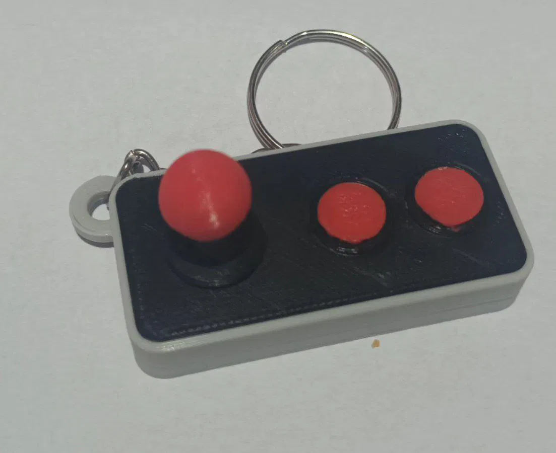 In móc khóa cần điều khiển arcade theo từng bộ phận riêng biệt theo màu sắc. Các nút bấm có thể in bằng chức năng thay đổi vật liệu. Phần đế đen cần điều chỉnh độ giãn ngang âm -0.1, các bộ phận khác in như bình thường.