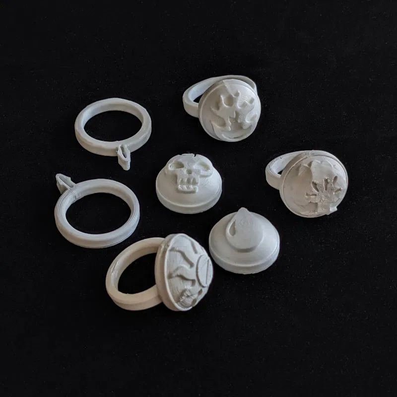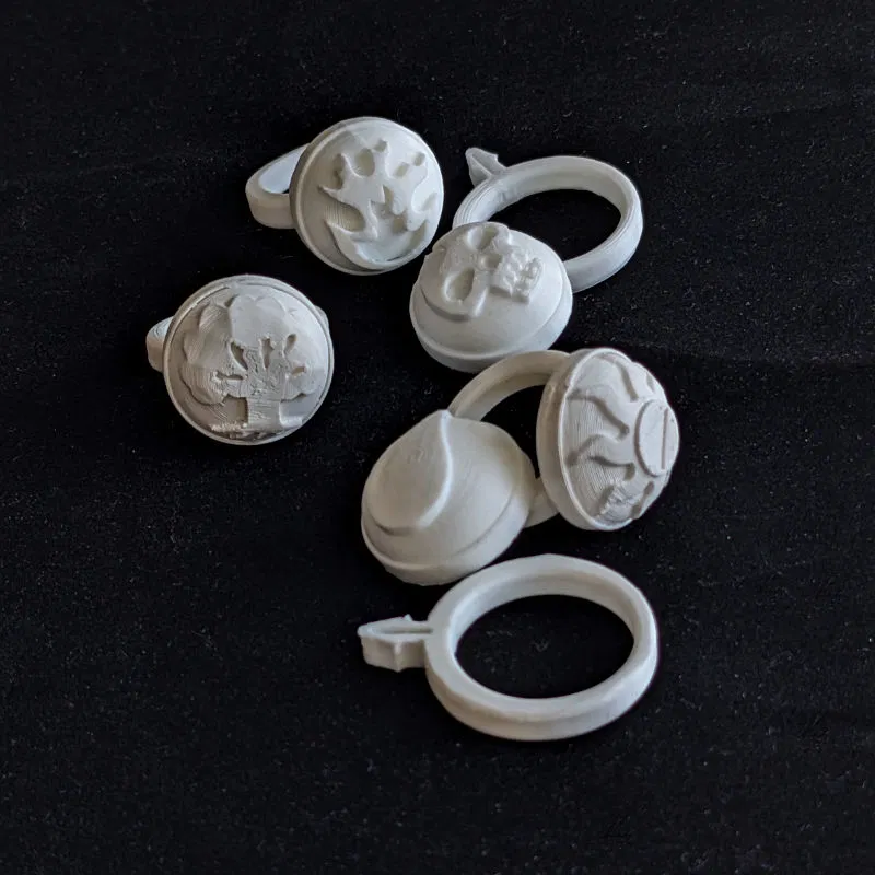 Tập hợp 5 chiếc nhẫn ma thuật đại diện cho các nguyên tố khác nhau. Mỗi pháp sư đều cần có những chiếc nhẫn này để kiểm soát các nguyên tố tự nhiên, thể hiện lòng trung thành với bộ tộc hoặc dùng làm dấu hiệu bí mật. Bộ sản phẩm bao gồm 5 kích cỡ nhẫn khác nhau, có thể in bằng PLA với vòi phun 0.4mm, không cần supports. Nhẫn và đá được thiết kế tách rời, dễ dàng lắp ráp.