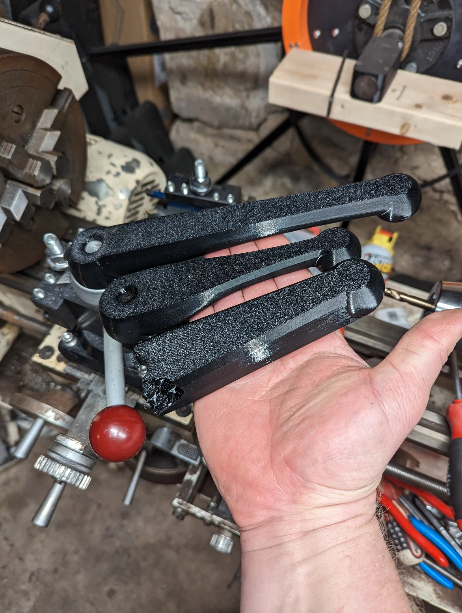 Trong hình bạn sẽ thấy bản rev0 và rev1 của mẫu này. Bản rev0 có infill thấp để kiểm tra độ vừa và kích thước tổng thể. Mình đã test thử tới hư luôn. Bản rev1 thì infill cao nhưng hơi ngắn để cầm nắm và tạo lực, góc nghiêng 12 độ cũng chưa đủ dốc. Bản cuối cùng này dài hơn và dốc hơn 14 độ cho cảm giác cầm rất đã. Bạn cũng có thể xem hình file .3mf với các bộ chỉnh sửa mật độ để tiết kiệm nhựa.