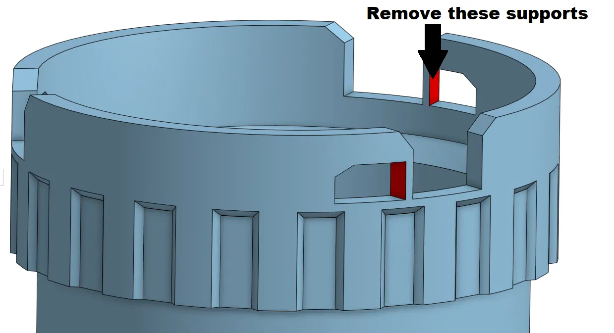 - Đầu nối ống được in với các lưỡi khóa hướng xuống dưới. Tui đã tích hợp các trụ đỡ vào các lưỡi để có thể in được. Chúng có thể được gỡ bỏ cẩn thận bằng kìm cắt hoặc kìm (xem hình ảnh MS paint tuyệt vời).