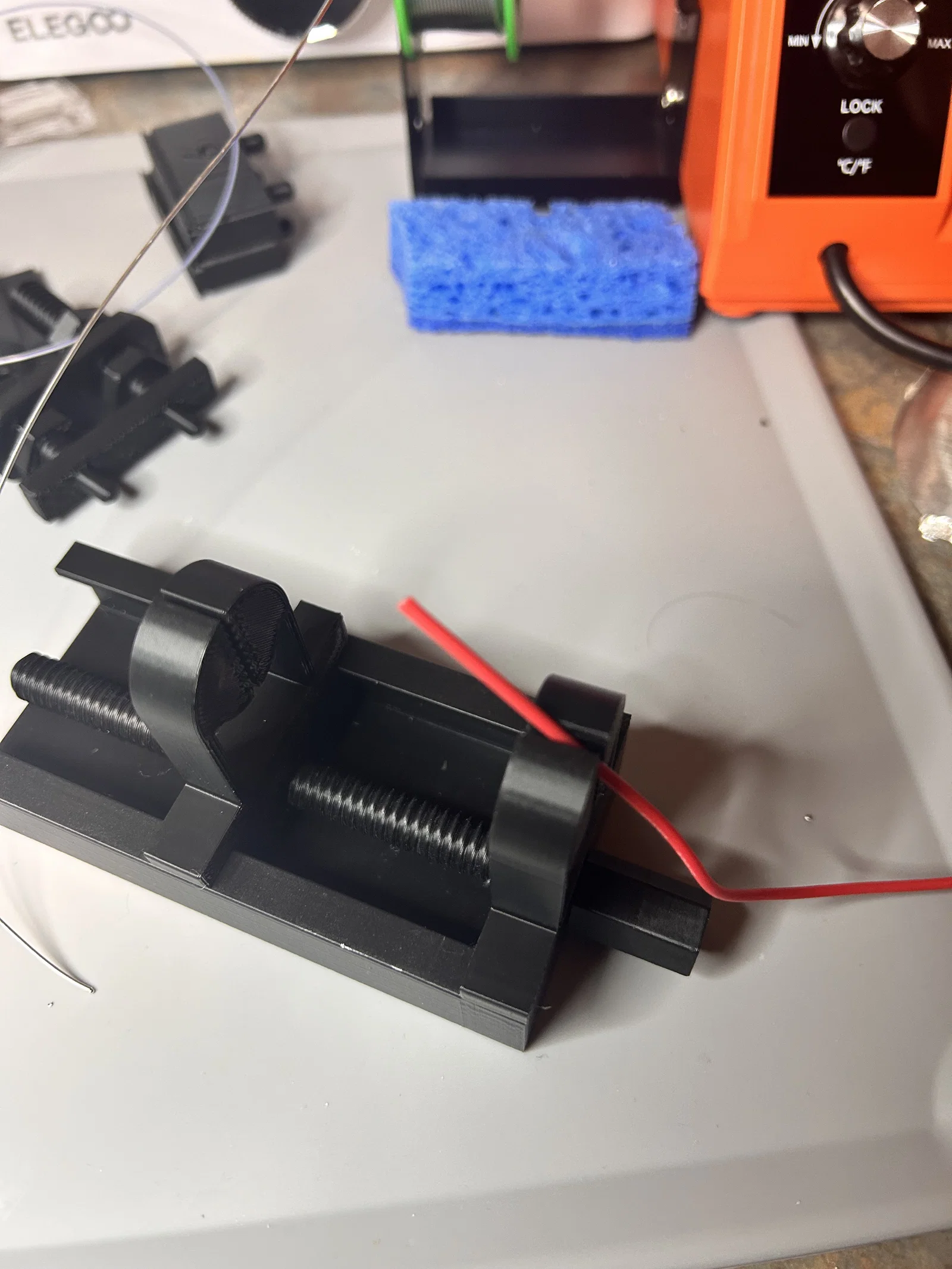 Một kềm kẹp mạch in (PCB) dạng module, dễ in và tùy chỉnh. Có các bộ phận thay thế, con đội vít và kệ đựng, lý tưởng cho việc hàn linh kiện và giữ đồ đạc trên tường lưu trữ.