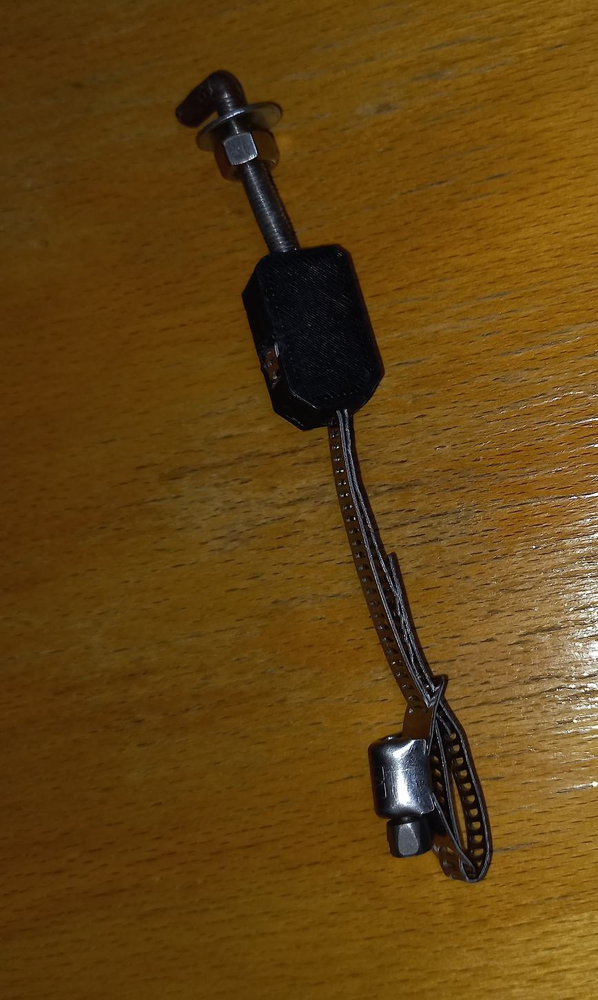 Mẫu in 3D này dùng để gắn dây đai kim loại vào ốc M5. Lỗ ren được tạo trực tiếp trên nhựa, phù hợp cho các ứng dụng không yêu cầu lực quá lớn. Dây đai được thiết kế hơi chặt để giữ chắc chắn.