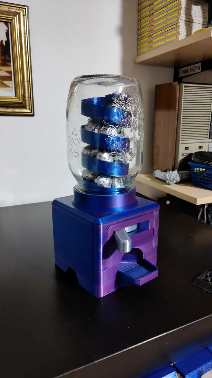 Trình phân phối sô cô la và kẹo độc đáo giúp bạn kiểm soát lượng kẹo ăn mỗi ngày. Lắp ráp đơn giản, chỉ cần lọ thủy tinh miệng rộng, vài con ốc và các bộ phận in 3D. Thích hợp cho Baci di Perugina hoặc các loại kẹo có kích thước tương tự.