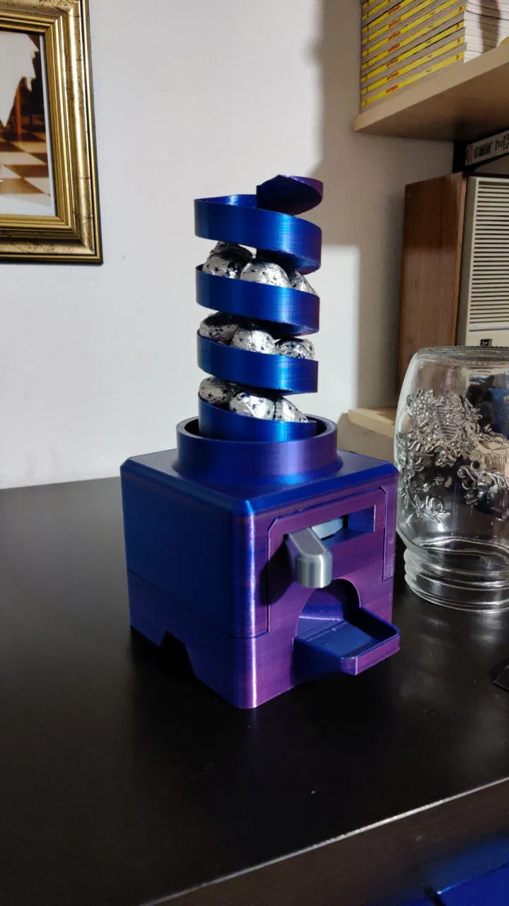 - 1 đai ốc M8 tự khóa (Bắt buộc phải là loại tự khóa, vì nếu dùng tay quay, nó có thể bị bung ra khỏi vị trí) Đầu tiên, vít M8 phải được luồn vào lỗ trung tâm của đế, đặt tay quay vào phần trên cùng với đai ốc tự khóa đã được lắp vào vị trí của nó. Thứ hai, hai đai ốc M5 phải được lắp vào các vị trí trong nắp. Sau đó, đặt nắp lên trên đế và sử dụng hai vít M5 để cố định mọi thứ, sau đó trượt bộ phận trượt bên ngoài vào chốt định tâm trên nắp, bộ phận này dùng để giữ nó ở vị trí ổn định. Sau khi lắp ráp xong, bạn có thể trượt kẹo xuống máng trượt và đậy lại bằng Lọ thủy tinh miệng rộng (Tôi cảm ơn ThomPatterson vì dự án của anh ấy) Tôi đã dùng Socola Bacetti di Perugina làm kẹo, loại kẹo có kích thước tương tự hoặc bánh kẹo khác (đường kính trung bình khoảng 30mm) cũng có thể dùng được. Chia sẻ những sản phẩm bạn đã tạo ra, và nếu bạn thích dự án của tôi, đừng ngần ngại theo dõi tôi nhé.