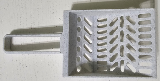 Dụng cụ gạt cát vệ sinh cho mèo, in làm 2 mảnh riêng biệt để dễ in, cần có supports. In bằng PLA, đế và tay cầm in riêng rồi dán lại.