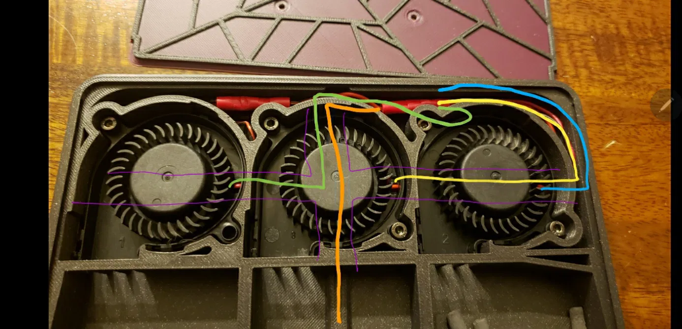 Vì vậy, bên dưới là sơ đồ đấu dây được vẽ kém. Màu tím là các rãnh trên đế. Tất cả các quạt đều có cả dây cực dương và cực âm, bạn có thể tách chúng ra một khi chúng đi vào khu vực quản lý dây phía sau. Tôi chỉ vẽ các đường dây dương. Bạn có thể thấy hai mối nối đôi của tôi trong ảnh. Cực dương ở bên phải, cực âm ở bên trái.