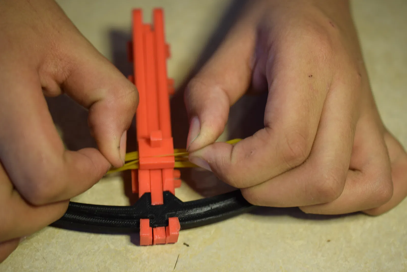 Đây là một cây nỏ khổng lồ có kèm theo chỗ giữ mũi tên. Hướng dẫn này chỉ bạn cách lắp dây thun cho phần giữ mũi tên của cây nỏ khổng lồ, đảm bảo mũi tên được cố định chắc chắn khi bắn.