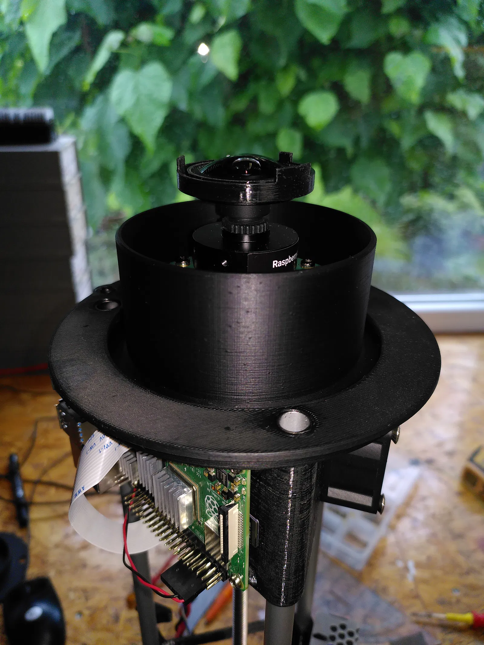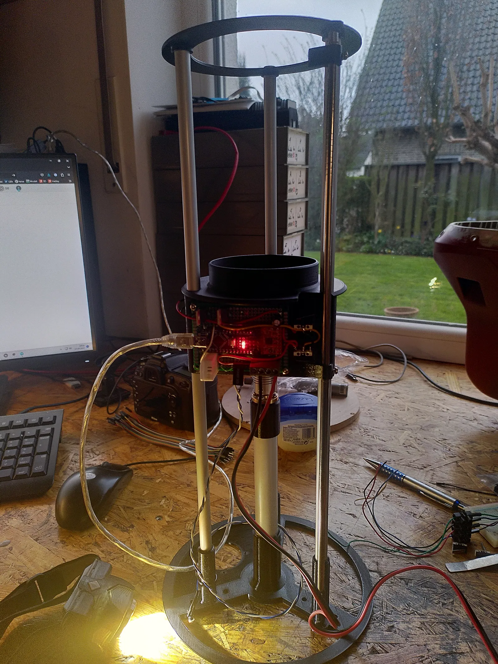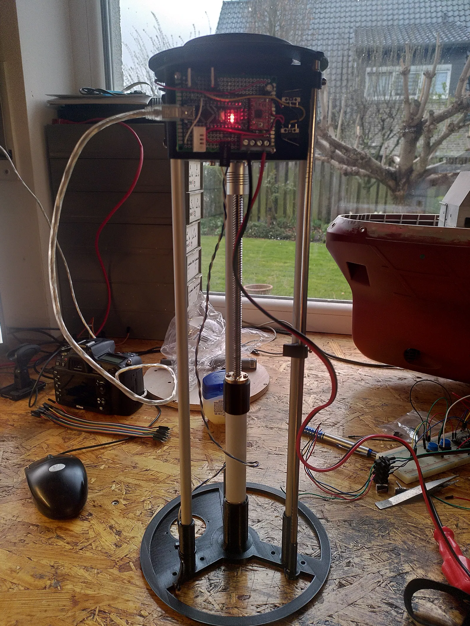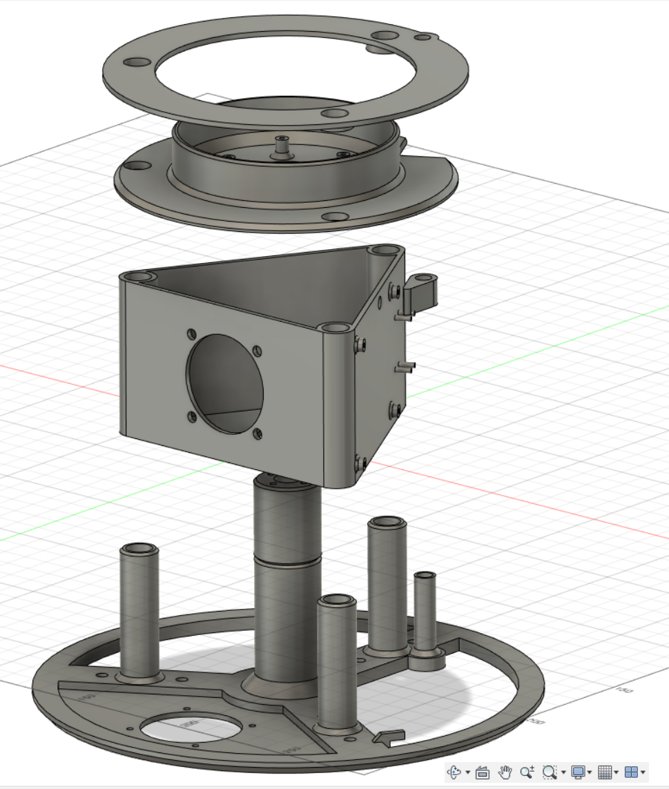 Tao muốn làm một cái camera allsky có motor. Cái nền tảng là con Pi4 và một cái camera HD như bình thường. Việc điều khiển chuyển động được điều chỉnh thông qua một con Arduino Nano với Steppershield và DHT22. Ban ngày, camera không nên bị phơi nhiễm với ánh sáng UV mạnh (đã loại bỏ bộ lọc IR), vì vậy nó rụt đầu lại như một con rùa từ một mức độ sáng nhất định trong ngày. Khi nhá nhem tối, nó sẽ tự động chạy lên để chụp đêm. Ngoài ra, còn có khả năng điều khiển 2 quạt tùy thuộc vào nhiệt độ. Một cái quạt thổi qua khe trượt và ra khỏi dưới camera, làm ấm cái vòm. Cái quạt thứ 2 có thể được gắn ở dưới để thông gió toàn bộ vỏ. Tất cả các bộ phận được kết nối bằng ống nhôm 10mm, phần đế và bộ phận giữ nguồn được dán lại. Được thiết kế cho các ống KG 20mm. Chiều dài của toàn bộ bộ phận phụ thuộc vào trục chính và các ống bạn chọn, ai cũng có thể tùy chỉnh. Tao dùng trục chính 200mm và có khoảng 100mm hành trình.
