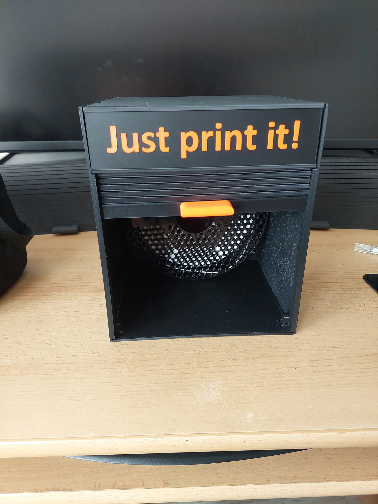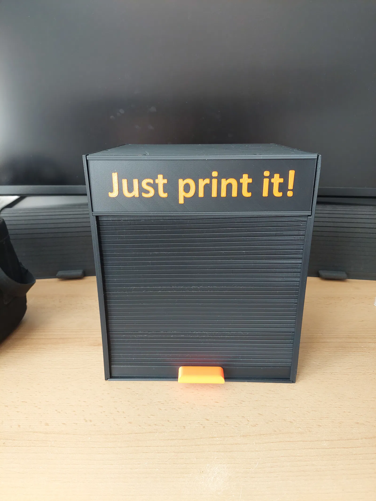 Một cái hộp để chứa mấy cuộn dây filament hoặc mấy món đồ linh tinh khác. Cái cửa cuốn nó trượt vào trong cái rãnh xoắn, nên là có đủ chỗ cho hai cuộn dây trong hộp luôn.