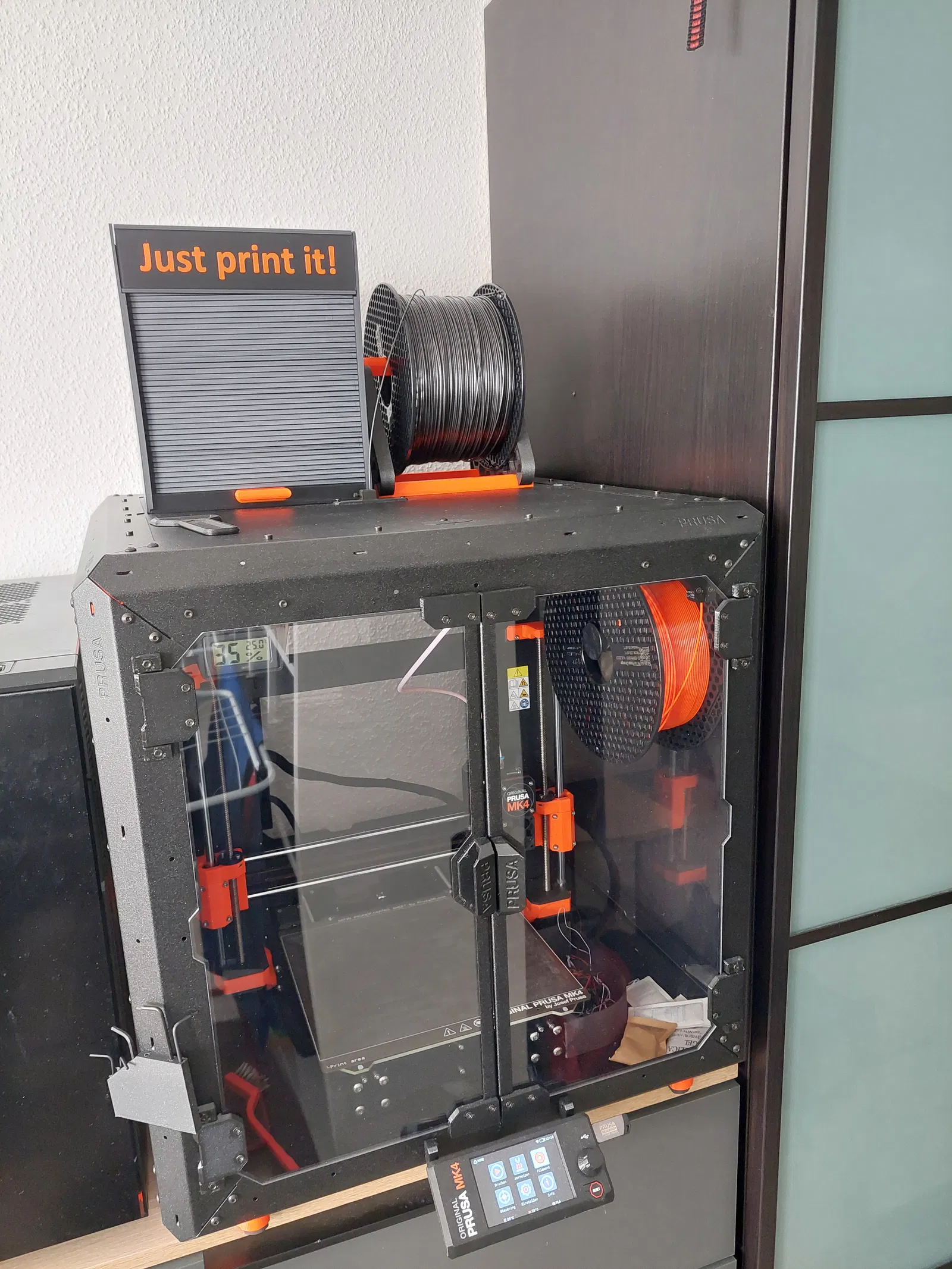Hộp đựng này có cửa cuốn và bảng hiệu có thể điều chỉnh, đủ chỗ cho hai cuộn dây filament. Bạn có thể chỉnh sửa bảng hiệu bằng Prusa Slicer. Cần 10 ốc nối ren M3*5*5 để lắp ráp.