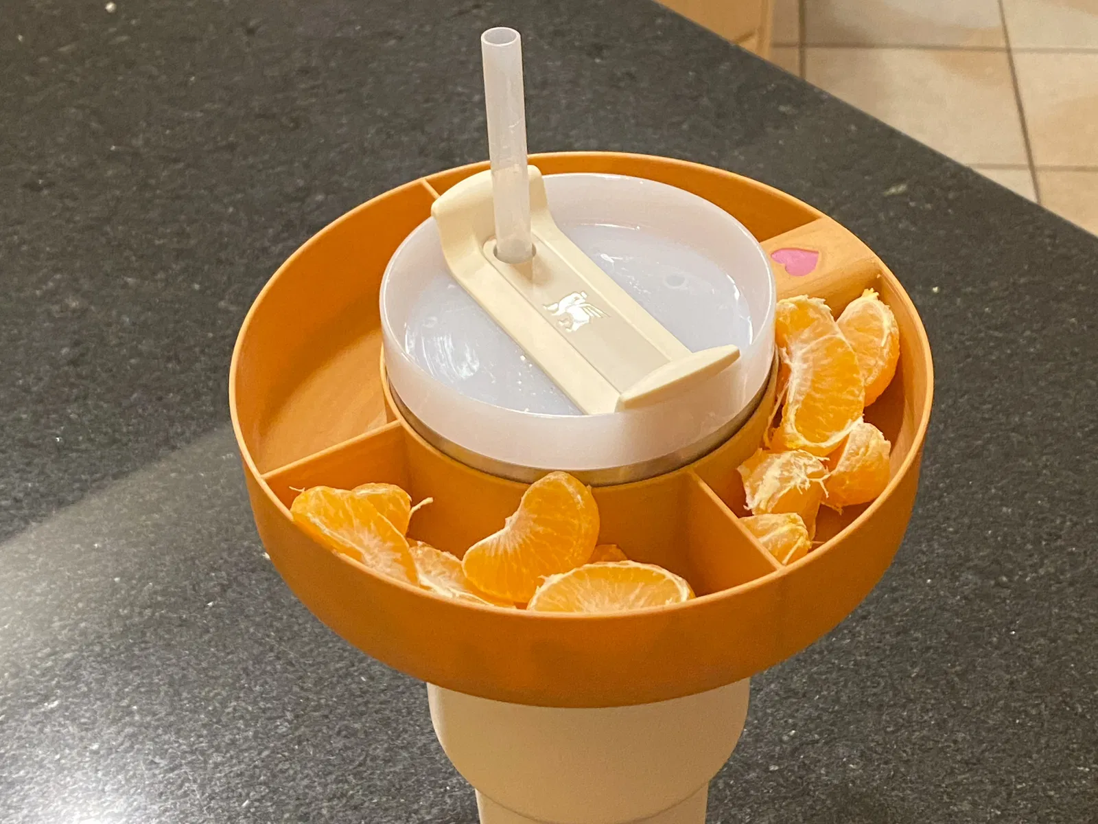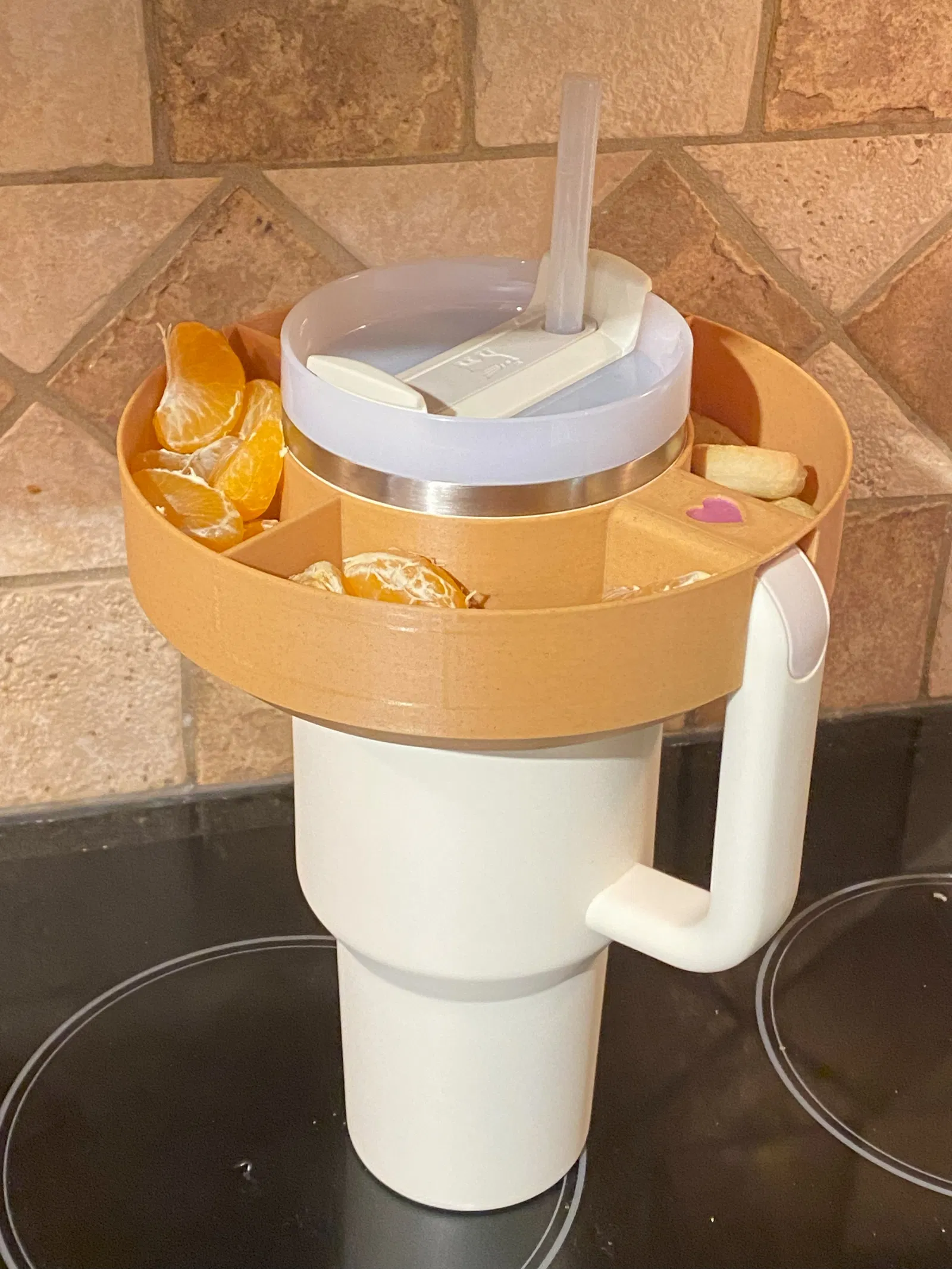 Cái khay đựng đồ ăn vặt đơn giản này là để gắn lên trên cái ly Stanley Tumbler (40oz) đó nè. Nó được chia làm bốn ngăn với một cái “cầu” để nằm phía trên quai cầm của ly luôn.